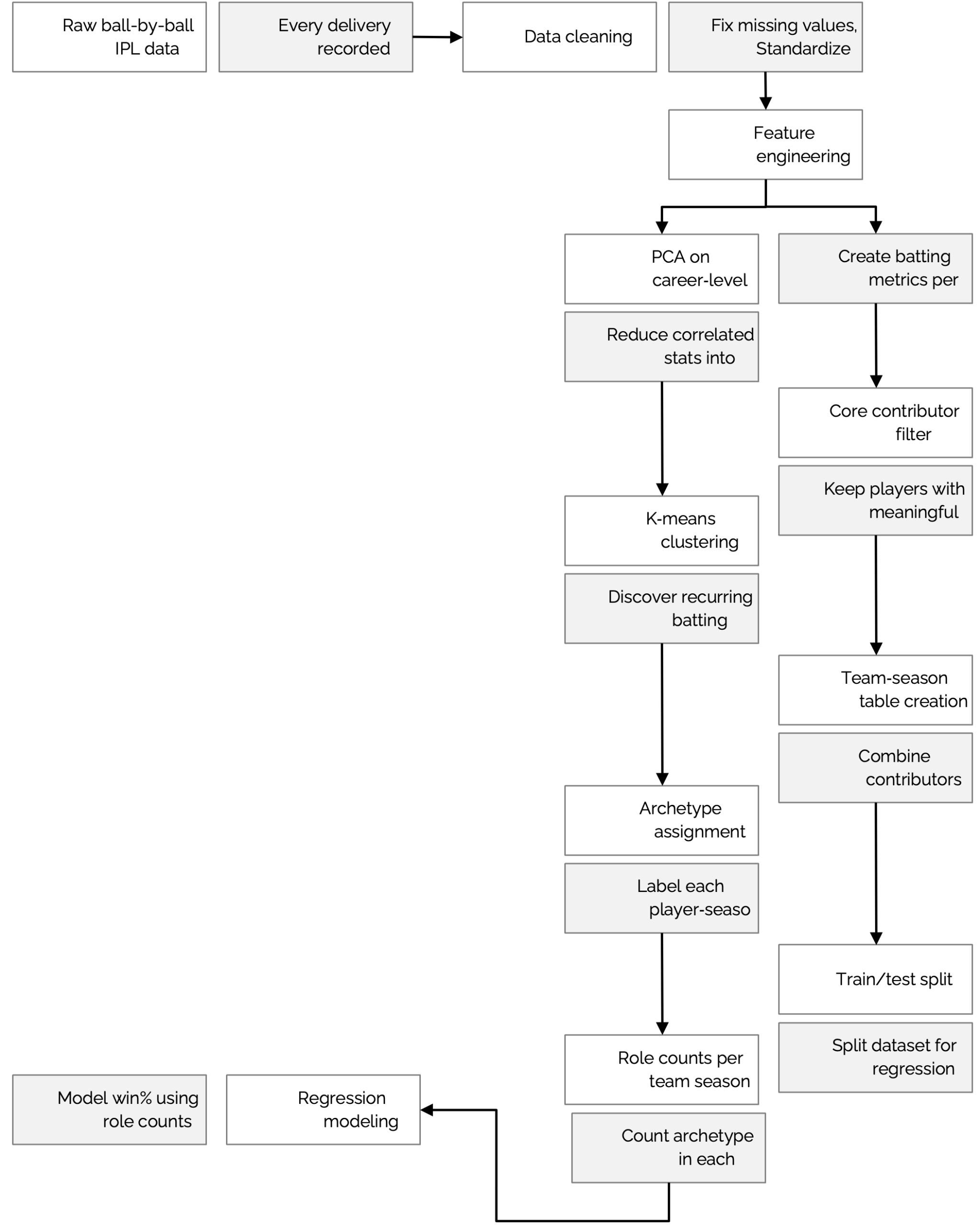 Figure 1 | End-to-end analytical workflow from raw ball-by-ball data to final regression modeling. The figure illustrates data cleaning, feature engineering, PCA transformation, clustering, and team-season aggregation steps.
