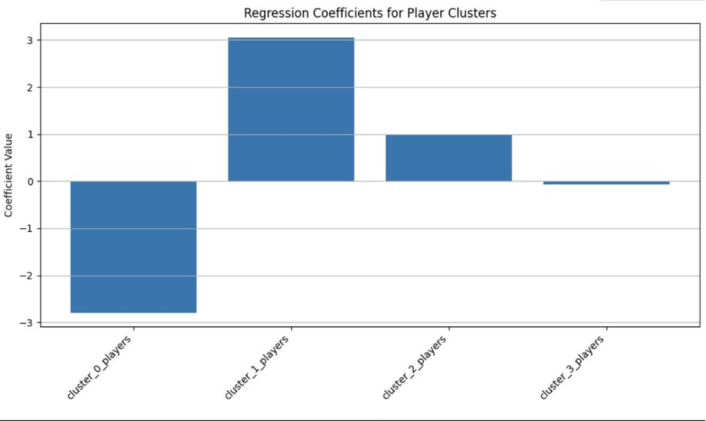 Cluster-1 and Cluster-2 player counts were associated with positive effects, with Cluster-1 exhibiting the largest positive impact (see Figure 5). Cluster-3 showed only small, slightly negative coefficient, indicating that steady or well-rounded players contributed modestly but were less influential than those in the first two clusters.