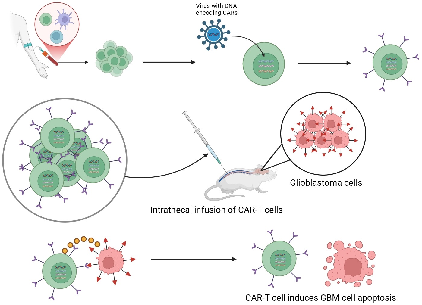 One notable advancement occurred in a recent study where researchers designed special types of CAR T-cells called bivalent CAR T-cells that have the ability to target glioma cells with high specificity through dual recognition of multiple cell-surface antigens19. In this clinical trial, the bivalent cells were programmed to recognize and attack cells expressing both the IL-13Rɑ2 and EGFR cancerous surface protein markers. Essentially, the main advantage of this technique is that the CAR T-cells bear CARs equipped with multiple antigen-binding domains that can attach to multiple different cancer surface antigens.20. These CAR T-cells were administered intracerebroventricularly, meaning they were injected into the cerebrospinal fluid (CSF) produced in a pocket of the brain called the lateral ventricles. Once successfully placed in the CSF, the CAR T-cells can circulate the brain and broadly attack any detected tumor cells.This study demonstrates the incredible potential of emerging new-generation CAR T-cell therapies – of the thirteen patients whose tumors could be visualized with imaging techniques, eight exhibited tumor shrinkage following CAR T-cell therapy administration. Granted, only one patient continued exhibiting stagnated tumor growth after 16 months, suggesting the need for strategies to improve CAR T-cell durability21.