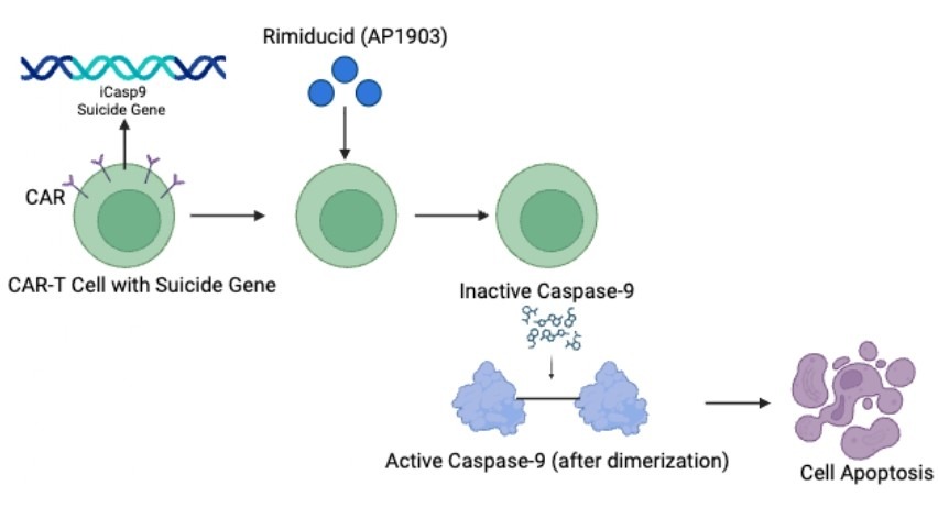A common suicide gene used in CAR T-cells is inducible caspase-9 (iCasp9). When two caspase 9 proteins pair together, or “dimerize”, they trigger a downstream biochemical cascade that results in cell death via apoptosis. The drug AP1903 will induce the pairing of these caspase 9 proteins in CAR T-cells, leading to CAR T-cell death while preserving normal cells that do not possess the iCasp9 gene59’60. Thus, by introducing suicide genes, researchers can selectively eliminate CAR T-cells in emergency cases when patients experience severe side effects.