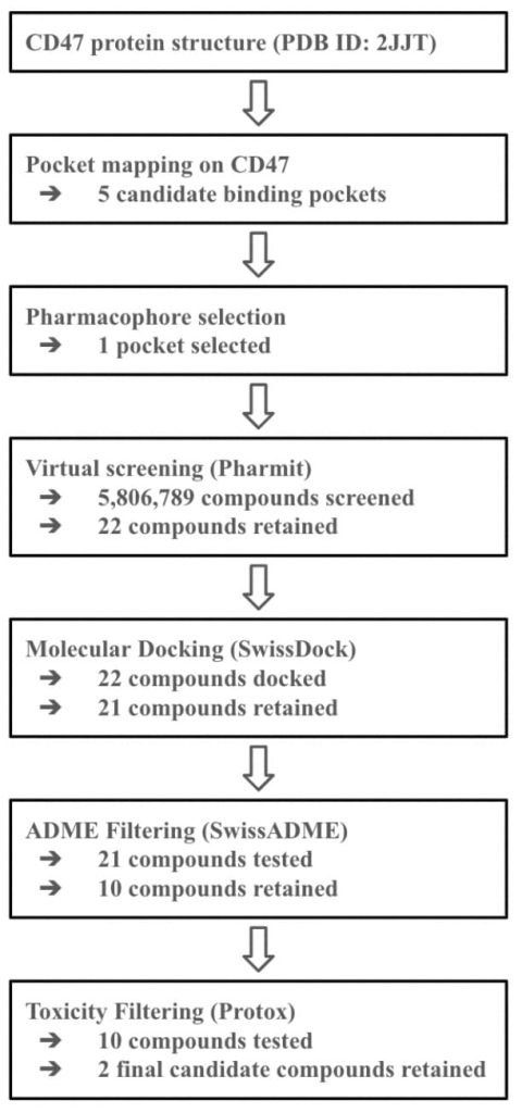 Small molecules are molecules with a weight less than 500 daltons13. In cancer therapy, small molecules can be used to inhibit proteins in cancer cells14. Antibodies bind to cancer cell antigens, tagging them so the immune system can destroy them15. They trigger immune response by interacting with immune cell receptors, helping the body kill cancerous cells and activate immune defenses16. Therefore, the central aim of this study is to identify druggable rockets on CD47 and apply a hierarchical virtual screening workflow to discover small molecules with the potential to disrupt the CD47-SIRPα immune checkpoint interface. It is hypothesized that structure-guided virtual screening can identify small-molecule candidates that bind CD47 and interface-relevant regions and warrant experimental testing for effects on CD47-SIRPα signaling.