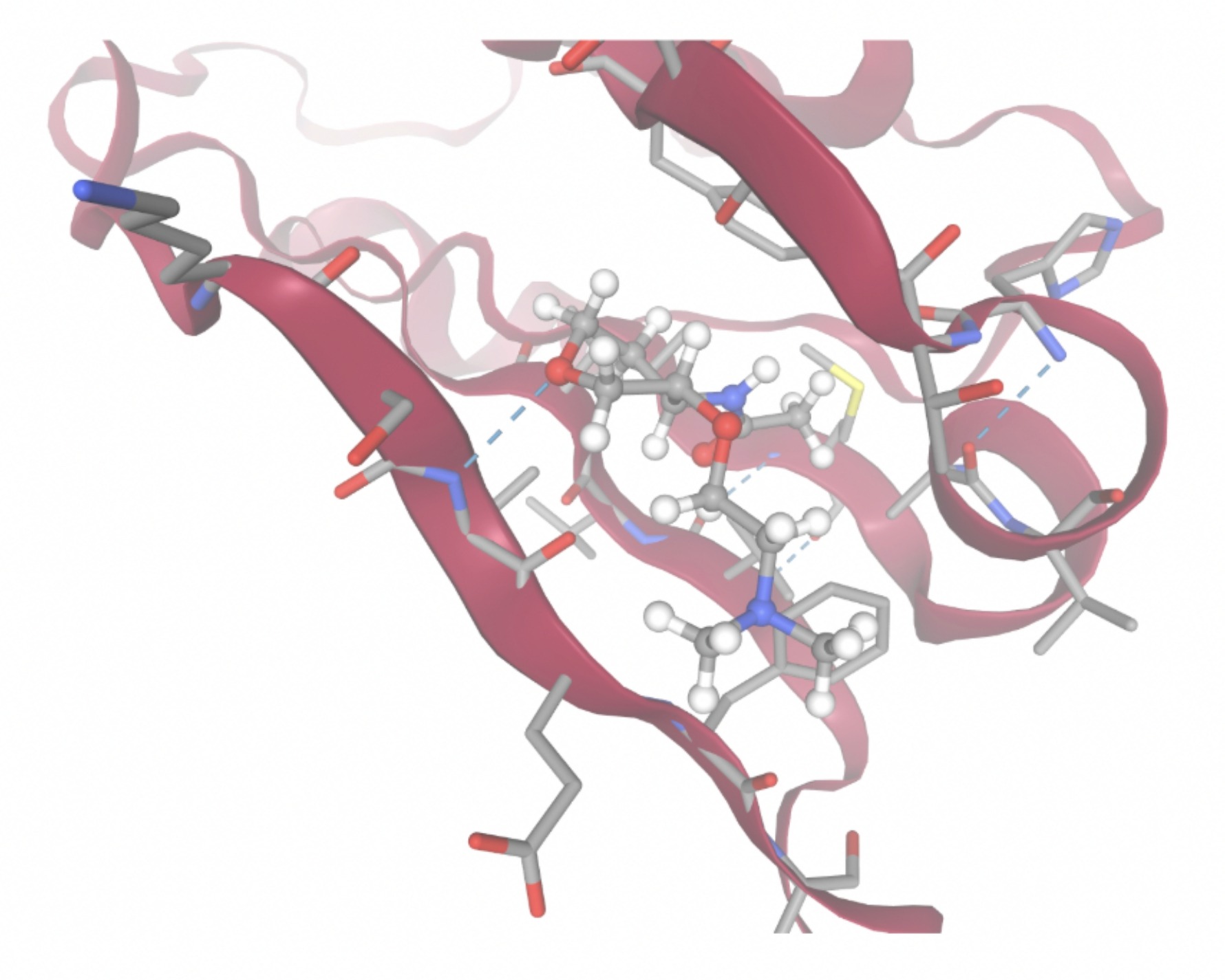 Using the PrankWeb server, 5 binding sites were identified that likely meet both the conditions: an energetically favorable reaction and a suitable volume for small molecules. The server predicted 5 binding sites which satisfy the criteria. These binding sites are listed in Table 3 with their probability scores, number of residues, example amino acids, and conservation values. Binding sites with higher probability scores are more likely to be true druggable sites. Figure 4 shows a 3D visualization of each binding site.