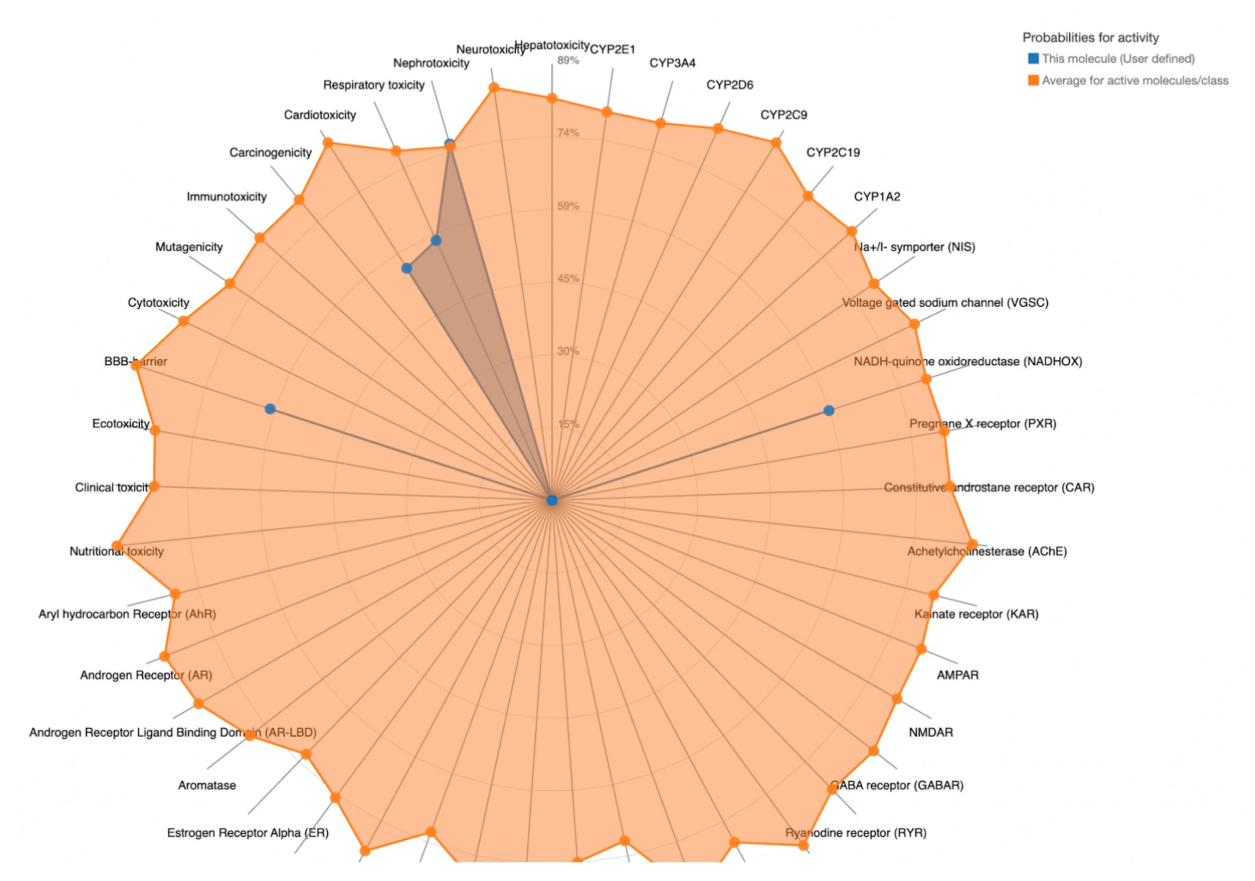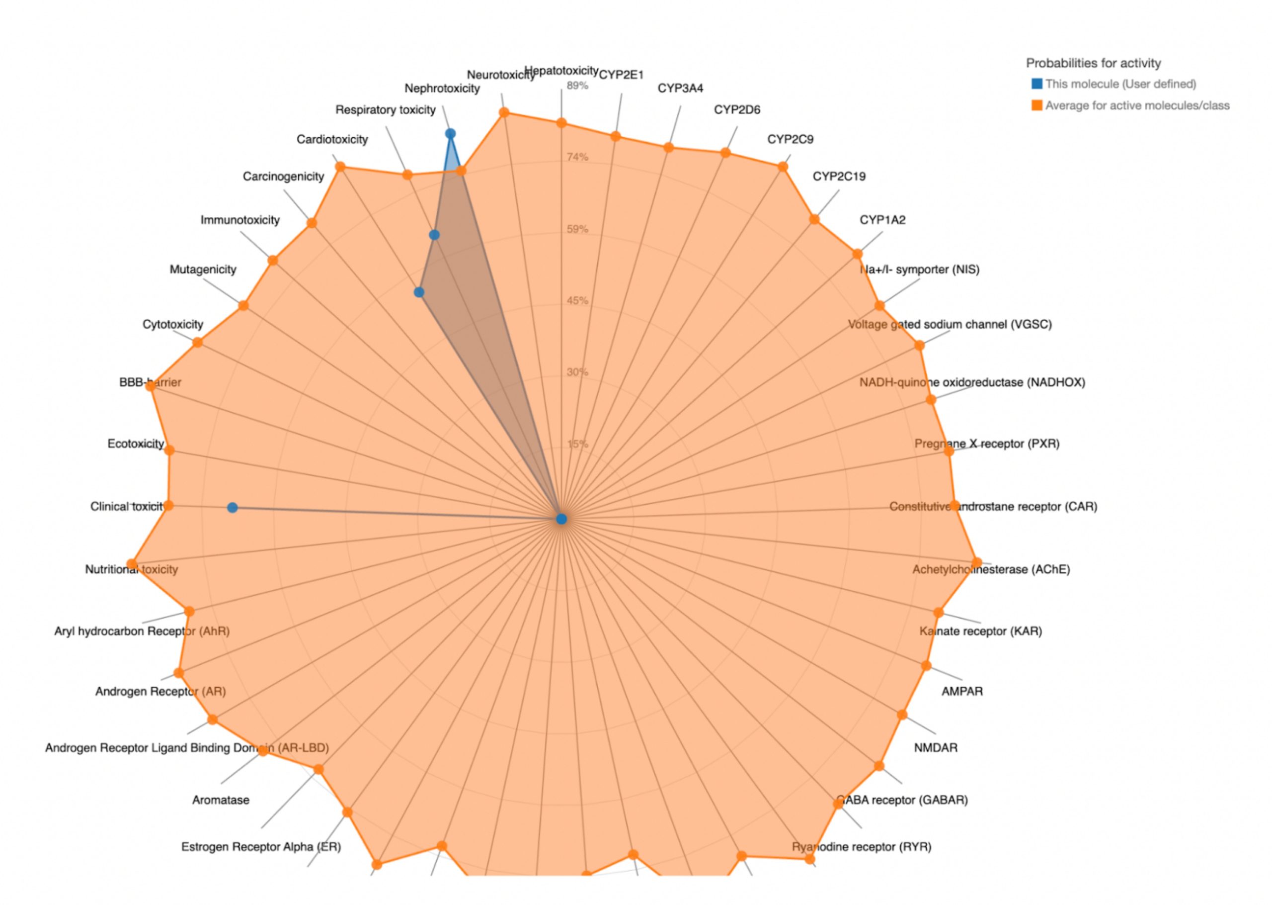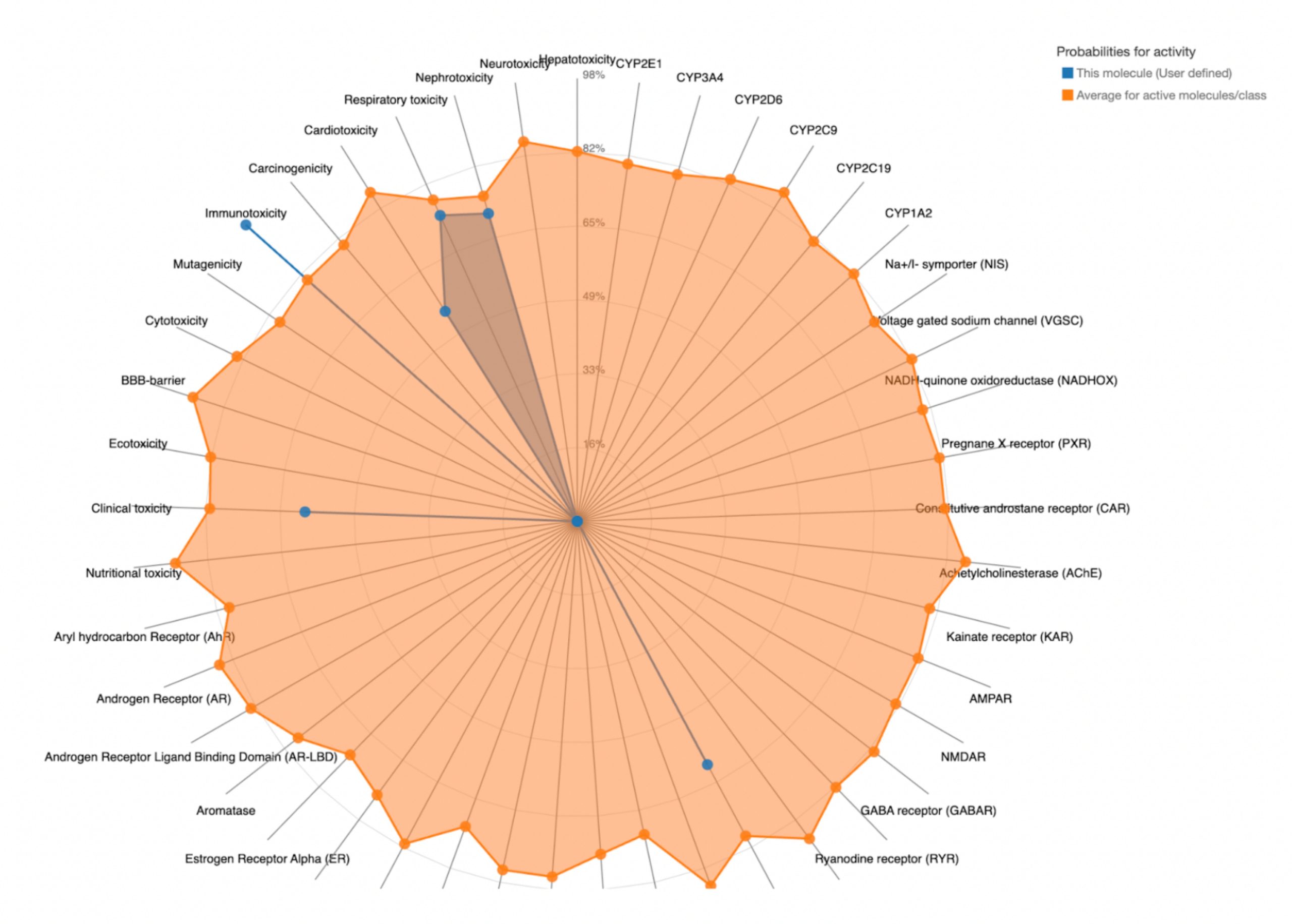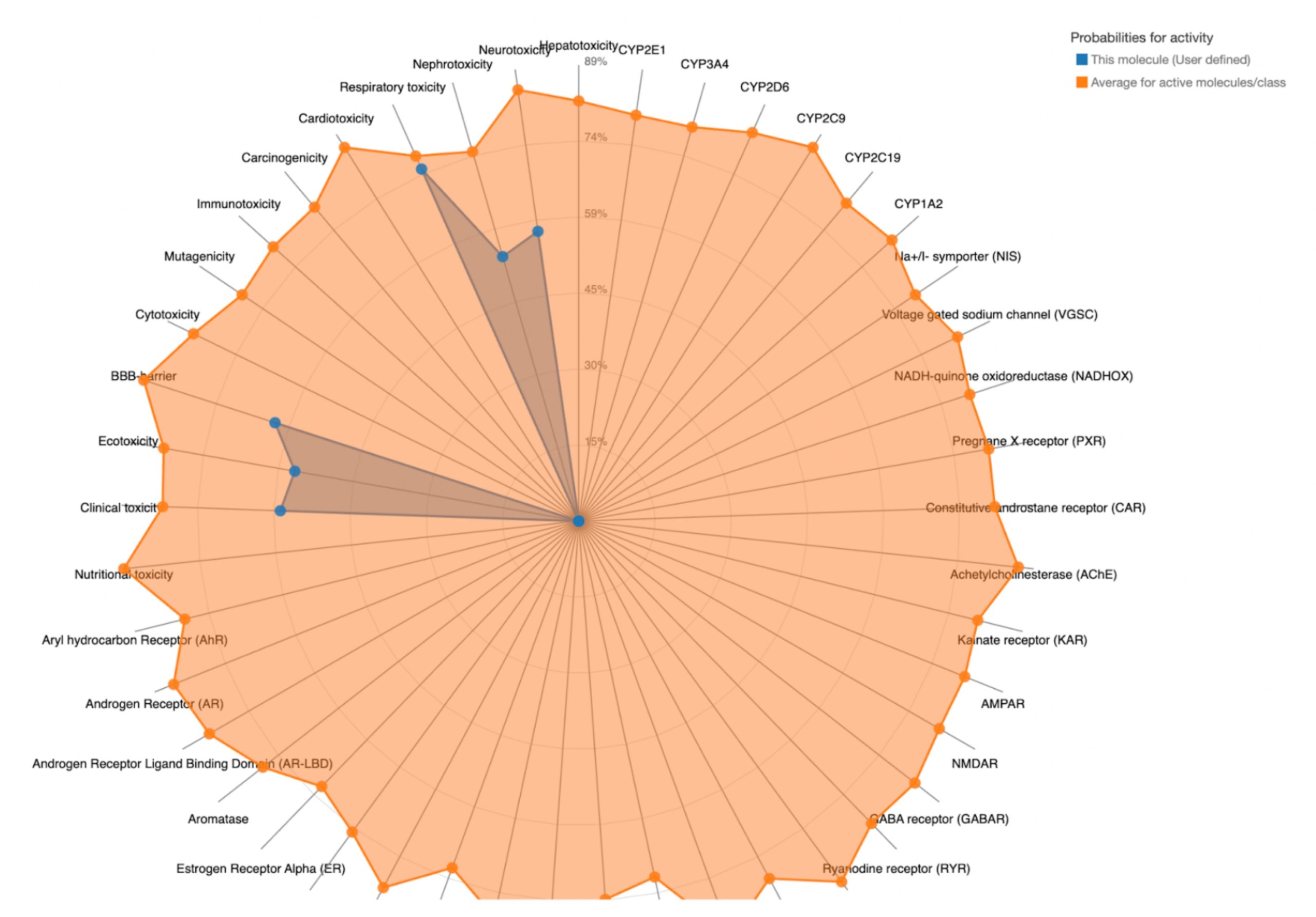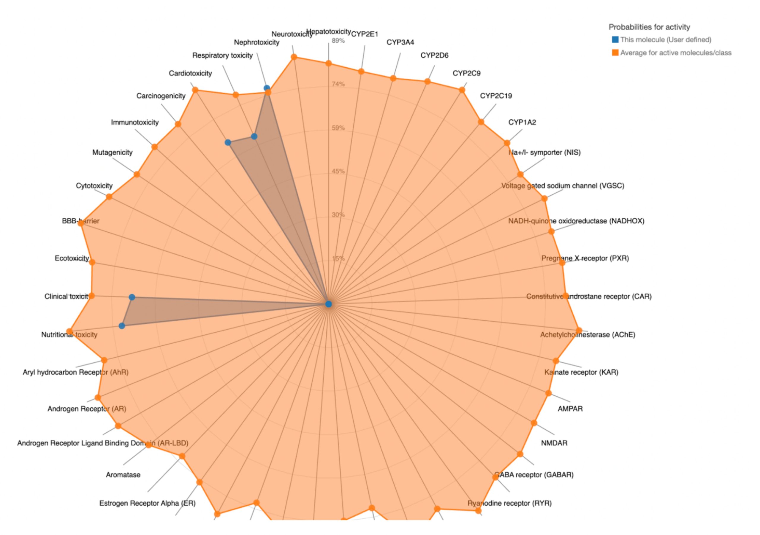 To further evaluate systemic tolerability, the user should examine the radar chart displayed below the results table. This chart compares the tested compound’s predicted toxicity to the average of known, approved drugs. The blue dots represent the compound’s predicted toxicity across different physical systems, while the orange dot shows the average toxicity of established drugs. If the blue dots fall closer to the center of the chart than the orange, the compound is considered to have an acceptable toxicity profile and is unlikely to be of significant risk to human health.
