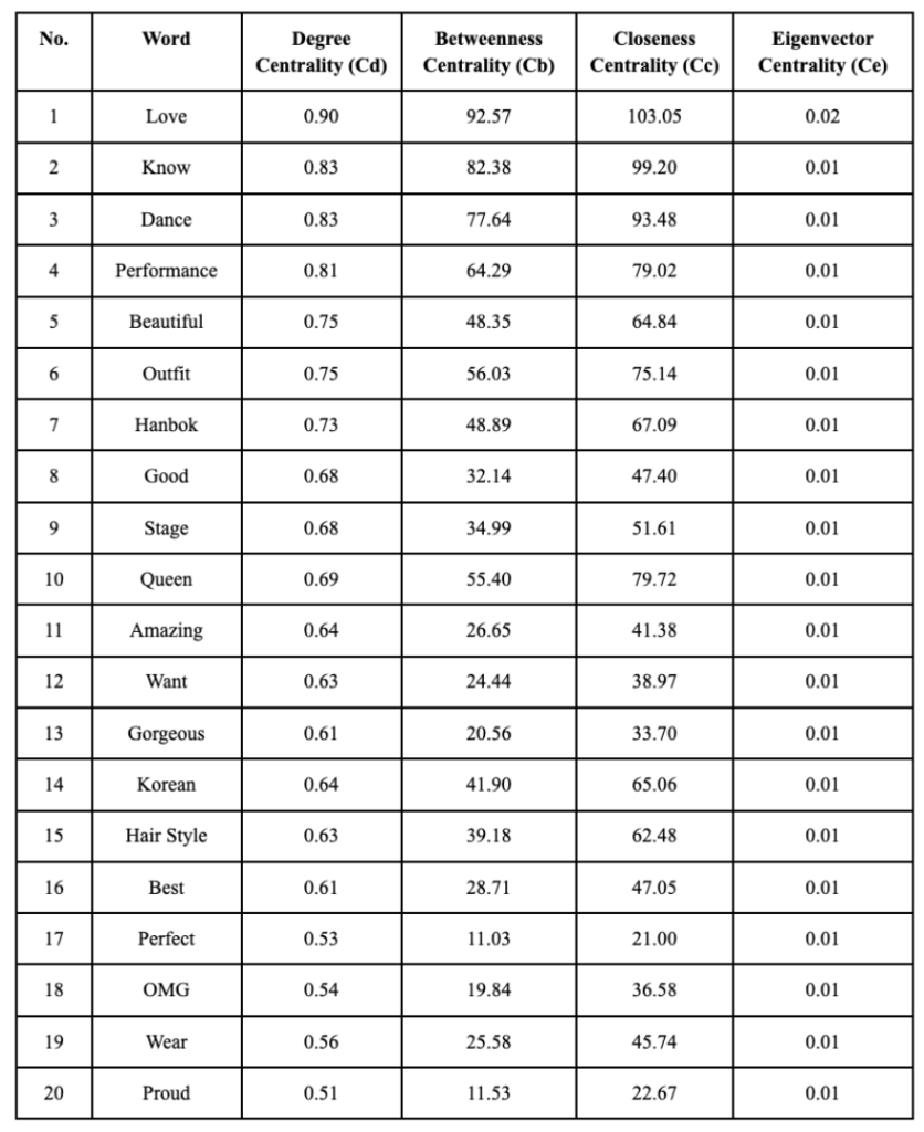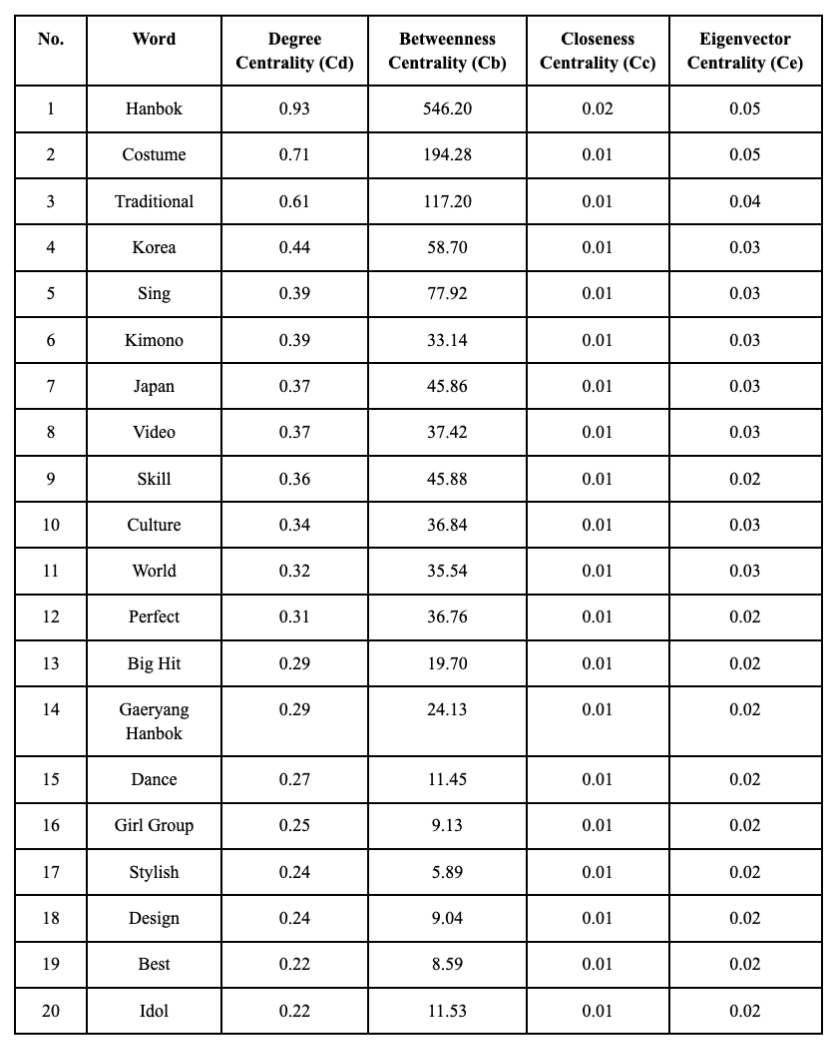 Table 2 | Top 20 Keywords Reflecting by Degree Centrality Related to Global Audience Response to K-Pop and the Modern Hanbok15.