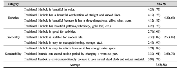 Table 3 | Survey Category and Results on Korean High School Students’ Perception about Traditional Hanbok22.