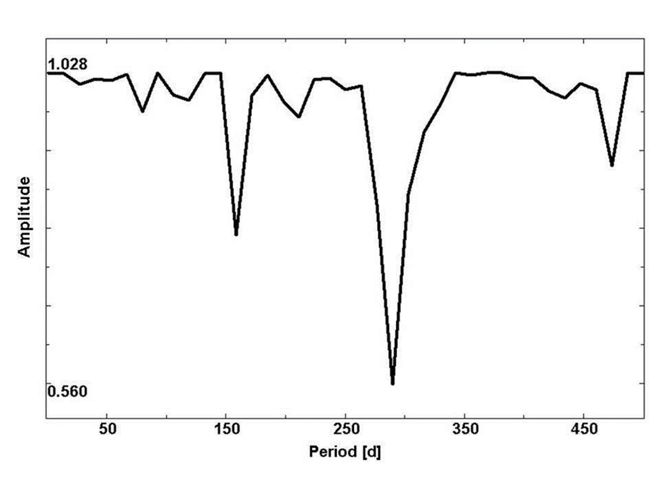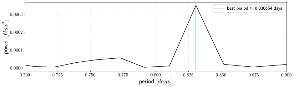 Best-Period Detection. The period, which is essential to modelling the light curve, is calculated with this step. A discrete Fourier Transform (DFT) is computed over the detrended light curve (y), and is stored in fourier. A sampling interval of time[1] – time[0]is then defined to evaluate the frequency. This step allows us to eyeball the values, i.e., aids us in detecting a suitable “best period” to fold our light curve over. In this case, DFT was solely used to detect the most dominant signal as a way of simplifying and efficiently computing the best period detection process. The BLS method is justified in the later steps, whilst being used in model fitting. Further, the inferred values are masked to retrieve only the non-zero frequencies. The period and power are then calculated using 1 / freq and by squaring the absolute value of fourier, respectively. It is done by: