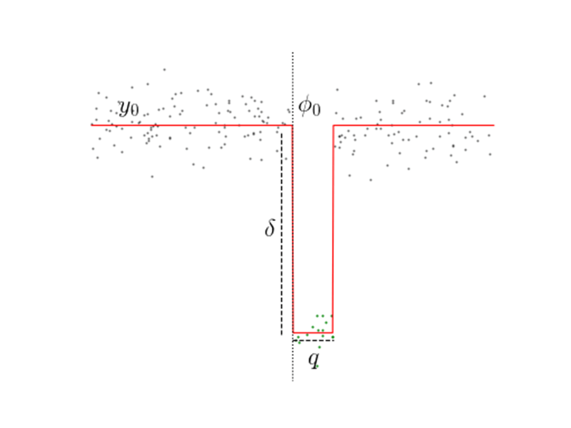 that alternates between two discrete brightness levels: A higher level, representing the star’s normal brightness (out-of-transit flux), and a lower level, representing the transit (in-transit flux). It assumes that the dip in the light curve looks like a “box” with a quick drop in brightness, then a steady period of low brightness, followed again by a sudden rise to normal.