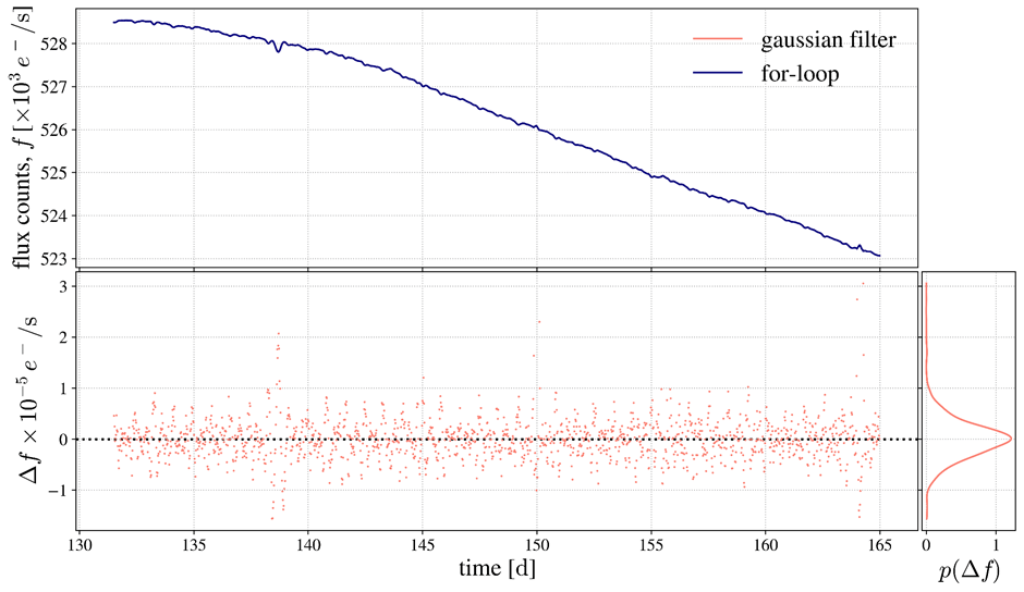 Additionally, a residual plot is also included, illustrating the accuracy of the manual implementation by highlighting fractional differences between the two smoothing methods. This is calculated by applying: 1 − (manual_smoothed / gaussian_smoothed), allowing for visualization of the relative deviation at each point along the light curve.