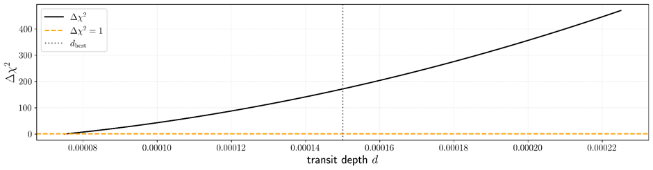 Since the uncertainty of the planet-to-star ratio is evaluated here, the transit depth’s uncertainty is what concerns the analysis the most. Therefore, for this, an uncertainty estimation is performed using a chi-squared profile. It is to find the mismatch between the observed data and the model, giving us an amount by which d is allowed to differ.