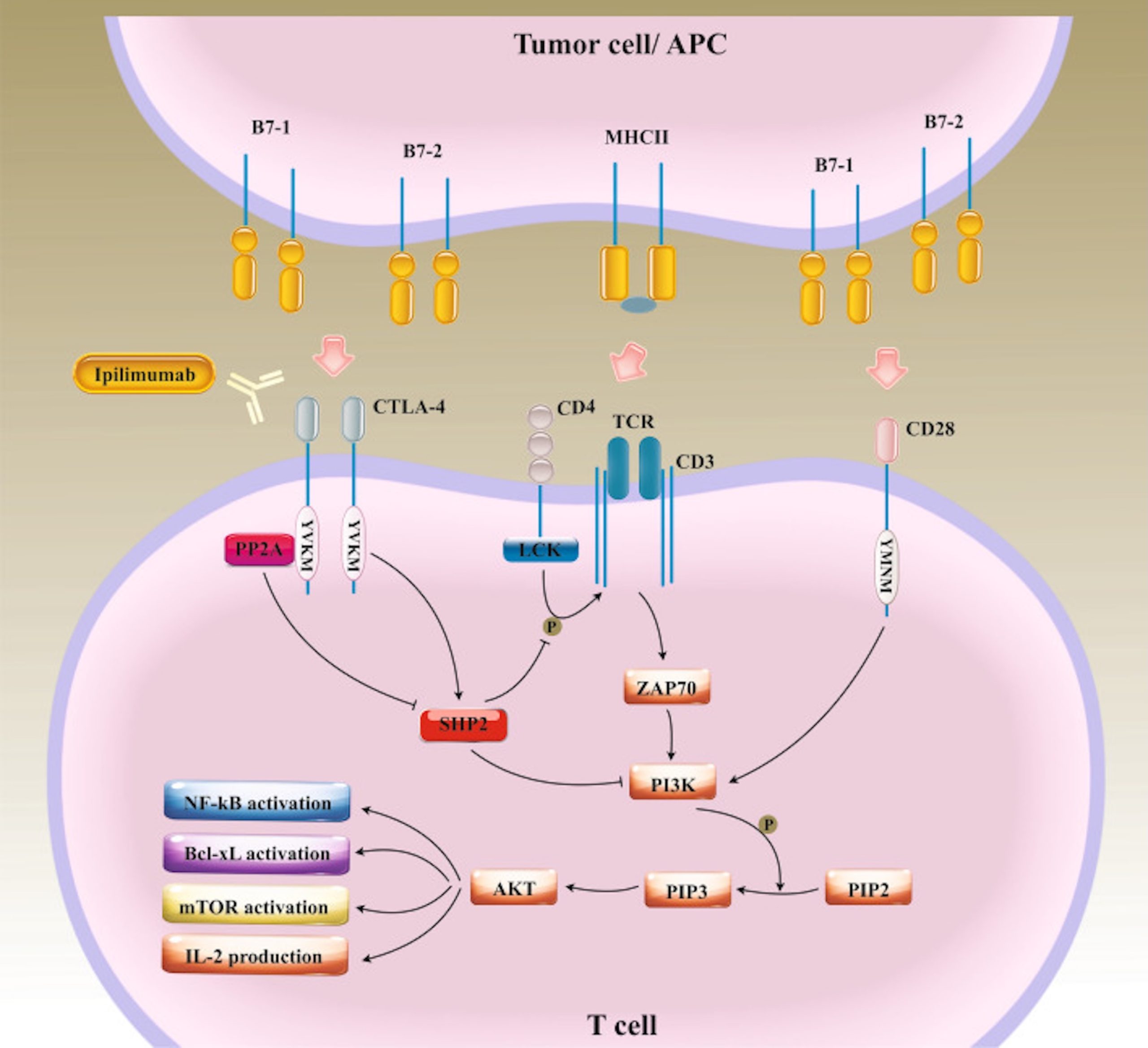 Figure 3 | Shows the inhibitory effects of CTLA-4/B7 on T cell antitumor activities. There is 30% homology between CTLA-4 which is expressed on the activated T cells and CD28. CD28 binds to the same ligands as CTLA-4 known as B7-1 and B7-2 expressed on tumor cells. This results in activation of SHP2 and so down regulation of PI3k/AKT axis.