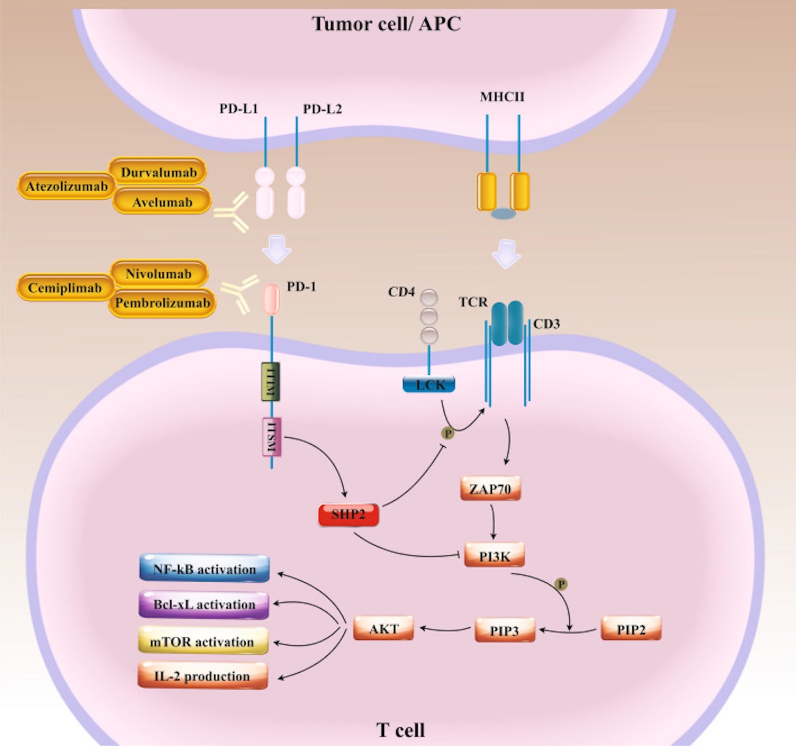 PD-1 expressed on T cells can bind PD-L1 and PD-L2 ligands expressed on the surface of various cancer cells. Upon ligand binding and activation, PD-1 cytoplasmic tail containing ITIM and ITSM motifs recruit SHP2 and suppress downstream signaling axes which lead to tumor cell evasion from T cell immunosurveillance13. (Figure 4).