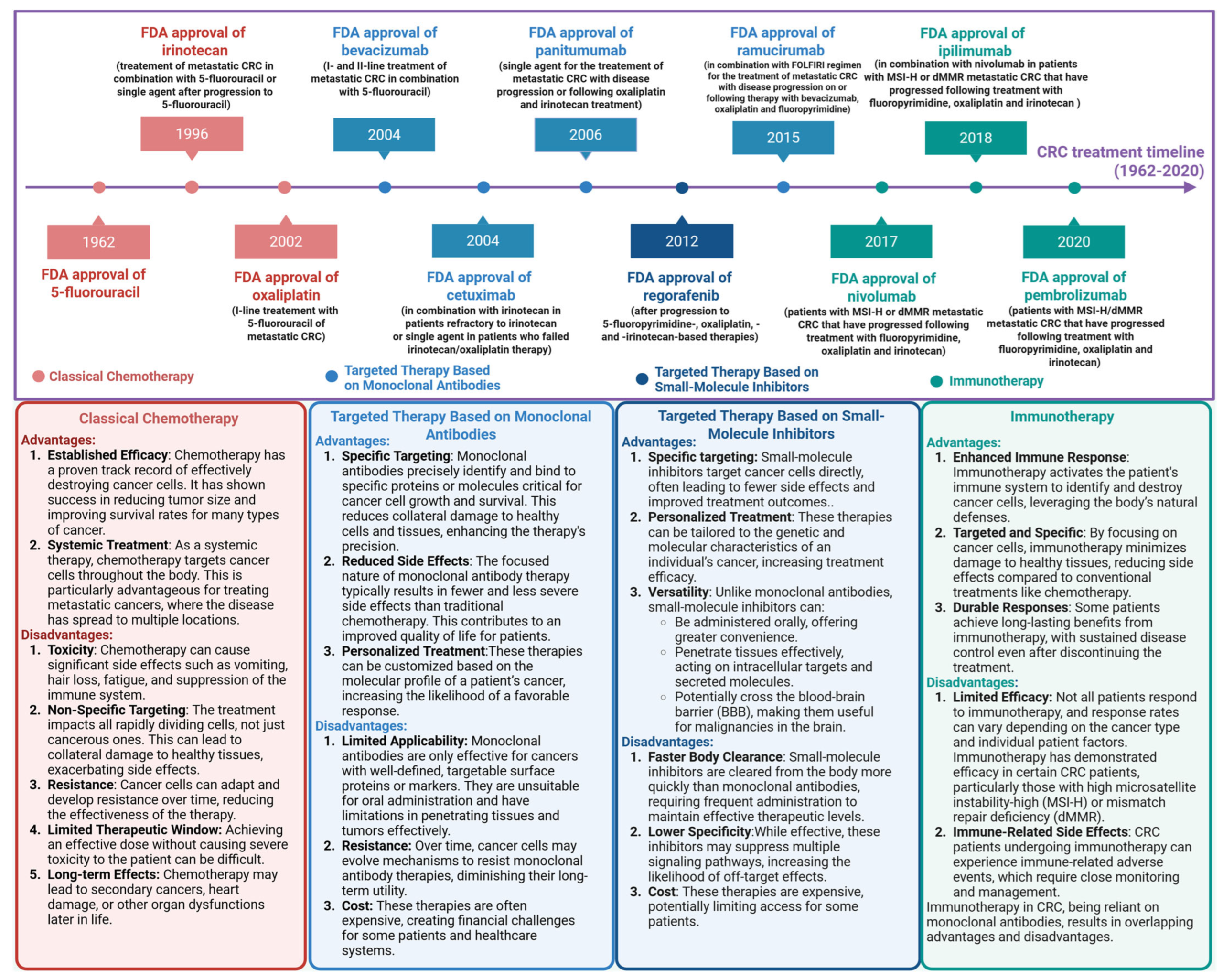Figure 5 shows the evolution of colorectal cancer treatments from 1962 to 2020 up to Pembrolizumab and Nivolumab. This includes classical chemotherapeutic agents (red), targeted therapies with the use of monoclonal antibiotics (light blue), small molecule inhibitor (dark blue) and immunotherapeutic agents (light green). The boxes below give a brief overview of their advantages and disadvantages. This is adapted from Kciuk 202516.