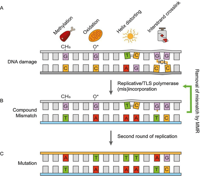 Figure 1 | Replication of Damaged DNA Panel A shows different causes of DNA damage including diet, radical oxygen species, UV radiation, and drugs. These lead to methylation, oxidation, and helix distorting DNA damage including intrastrand crosslinks. Panel B shows compound mismatches that arise from damaged bases when not corrected by MMR. Panel C shows fixed mutations resulting from the unrepaired DNA sequences. This figure is adapted from Ijsselsteijn 20201