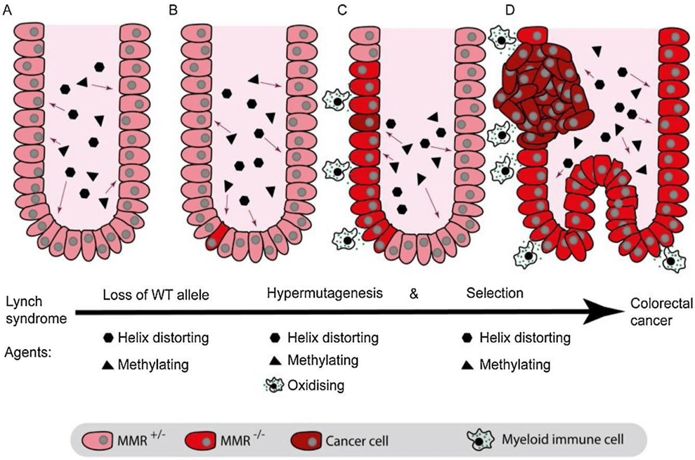 Figure 2 | This figure illustrates the development of colorectal cancer influenced by methylating and helix-distorting DNA lesions in the context of Lynch Syndrome. It shows how the gastrointestinal crypt cells in Lynch Syndrome patients evolve due to DNA damage to form colorectal cancer. This figure is adapted from Ijsselsteijn 20201.