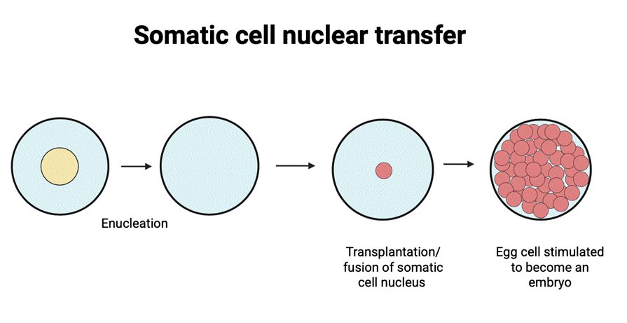 The injection of the somatic nucleus into the oocyte cytoplasm initiates programming and development of an embryo by histone replacement, DNA demethylation, premature chromosome condensation (PCC), chromatin remodeling, and transcriptional activation before zygotic genome activation (ZGA). These processes work together to mimic fertilization without meiosis7. Performing SCNT with genes that can aid in the treatment of a disease results in transgenic species and recombinant proteins that can be used for clinical procedures in biomedical science. By the fusion of the somatic nucleus and an enucleated oocyte, embryos are generated along with embryonic stem cells (NT-ESCs). Stem cells are now under research to be targeted to be immunocompatible to the patient to perform regenerative medicine, although this approach is currently experimental. These cells can be derived from the embryo by isolating and culturing inner cell mass at the blastocyst stage of the embryo. Stem cell clinical therapies are widely used, especially for COVID-19 or pulmonary diseases. In order to prevent immune rejection of the cells, a patient’s own somatic nuclei are being used to create an embryo from which the stem cells can be derived to help in successful cell transplantation8.