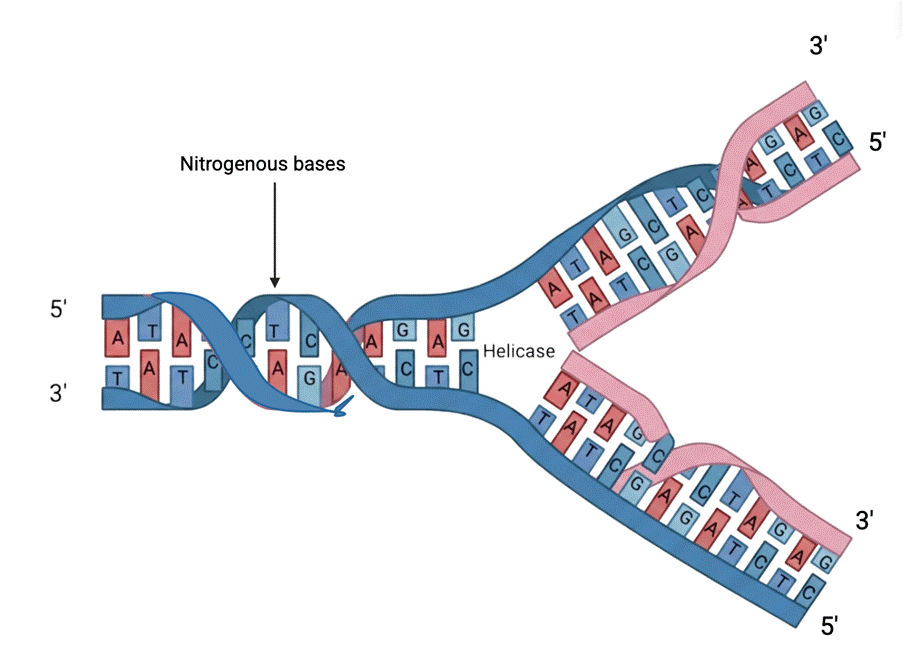 A nucleotide is a nucleoside molecule bound to one or more phosphate groups through ester linkages to the sugar moiety. Both DNA and ribonucleic acid (RNA) consist of polymers composed of nucleotides. Base-pairing is a template-based mechanism for DNA replication in which genetic material is copied into a complementary DNA sequence. Each nucleotide in the strand is recognized and assembled with a complementary nucleotide. This process causes the two strands of the helix to separate. This forms the hydrogen bonds, setting it for enzyme-catalyzed polymerization of a fresh chain. Each daughter strand inherits one parental strand and one freshly-produced strand in the double helix. This progressing structure then forms a “Y” shape which is called the “replication fork” which moves along the parental strand. In that region, the daughter strand genetic material is synthesized and copied by a mix of enzymes that contain DNA polymerase. The daughter cell strand that is being synthesized continuously is called the “leading” strand, and the one that is processed discontinuously is called the “lagging” strand. The direction in the development of the “lagging” strand is opposite to general chain growth. It is delayed due to discontinuous synthesis of the lagging strand before the maturation and ligation of Okazaki fragments (newly synthesized strands’ fragments), between the lagging and template strand (Figure 2). This “backstitching” mechanism requires “5′-to-3′ type” DNA polymerase10.