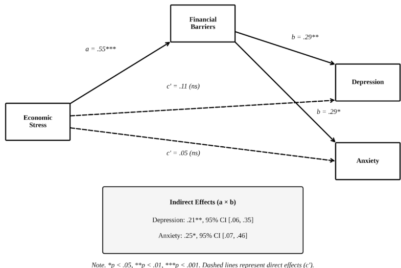 The study addresses two primary research questions:H1:Greater economic hardship will be associated with poorer outcomes in both domains; H2: healthcare access barriers will mediate the relationship between economic hardship and mental health outcomes, such that increased economic hardship leads to greater healthcare barriers, which in turn predict higher levels of depression and anxiety