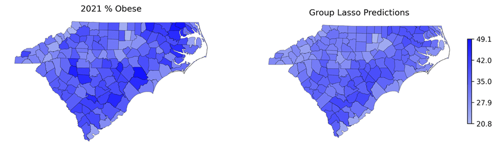 To forecast next-year outcomes for county-level obesity, physical inactivity, and physically and mentally unhealthy days, we employed a suite of linear regression models: OLS regression, Lasso regression, and group Lasso regression using comprehensive SDOH predictors. Based on the County Health Rankings & Roadmaps database, the obesity is measured by percentage of adults that report BMI >= 30; physical inactivity is reported as percentage of adults that report no leisure-time physical activity; the physically unhealthy days is defined as average number of reported physically unhealthy days per month; and mental health unhealthy days is calculated by the average number of reported mentally unhealthy days per month. A comprehensive set of SDOH variables for counties in NC and SC were combined using the AHRQ SDOH Database. This curated resource integrates data from multiple federal and public datasets, including the American Community Survey (ACS), the Area Health Resources Files (AHRF), and the American Foundation for AIDS Research (AMFAR).