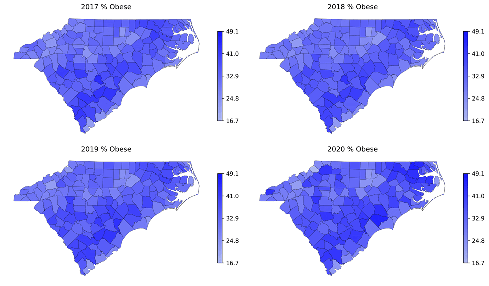Figures 4-7 present county-level heatmaps of four outcomes. The heatmaps reveal consistent spatial patterns across years and an overall worsening trend over time. To further characterize temporal patterns, we quantified the consistency of changes over time for each outcome by counting (i) counties exhibiting a strictly monotonic increase across all four years and (ii) counties showing increases in three of the four years. For obesity prevalence, 35 counties demonstrated monotonic increases, and 56 increased in three of four years. Physical inactivity showed fewer strictly monotonic increases (16 counties), though 70 counties increased in three of four years. No counties exhibited strictly monotonic increases in either physically unhealthy days or mentally unhealthy days; however, 13 and 74 counties, respectively, showed increases in three of the four years. York County has demonstrated the consistent increase in both obese and physical inactivity. Edgefield, Lee, and Macon Counties show a consistent increasing pattern in three of the four years across all four outcomes. 19 counties have consistent increasing pattern in three of the four years among three outcomes.