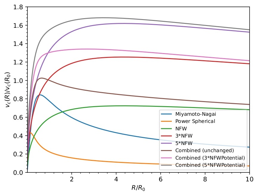and onwards, the combined rotation curves plateau. We can conclude that the dark matter halo potential is responsible for this observation, as its rotation curves resemble a similar shape to that of the combined potential. When the NFW potential is multiplied several times, it becomes the dominant form of matter in the Milky Way, elucidating its effect on the flat part of the combined rotation curve.