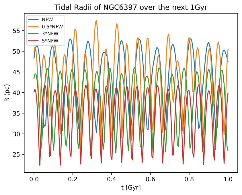 Figure 2B displays NGC6397’s tidal radius against time graph under four different NFW potentials. Under the normal potential indicated in blue, the maximum tidal radius is 53.046 pc while the minimum is 30.239 pc. Under the halved NFW potential indicated in orange, the maximum tidal radius is 57.437 pc while the minimum is 25.696 pc. Under the tripled NFW potential indicated in green, the maximum tidal radius is 46.066 pc while the minimum is 25.312 pc. Under the quintupled NFW potential indicated in red, the maximum tidal radius is 41.884 pc while the minimum is 22.367 pc.