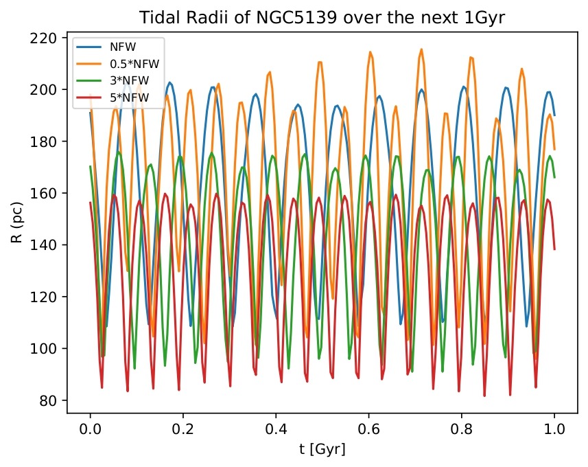 Figure 3B displays NGC5139’s tidal radius against time graph under four different NFW potentials. Under the normal potential indicated in blue, the maximum tidal radius is 202.679 pc while the minimum is 108.450 pc. Under the halved NFW potential indicated in orange, the maximum tidal radius is 215.482 pc while the minimum is 96.036 pc. Under the tripled NFW potential indicated in green, the maximum tidal radius is 175.940 pc while the minimum is 91.055 pc. Under the quintupled NFW potential indicated in red, the maximum tidal radius is 159.738 pc while the minimum is 81.687 pc.