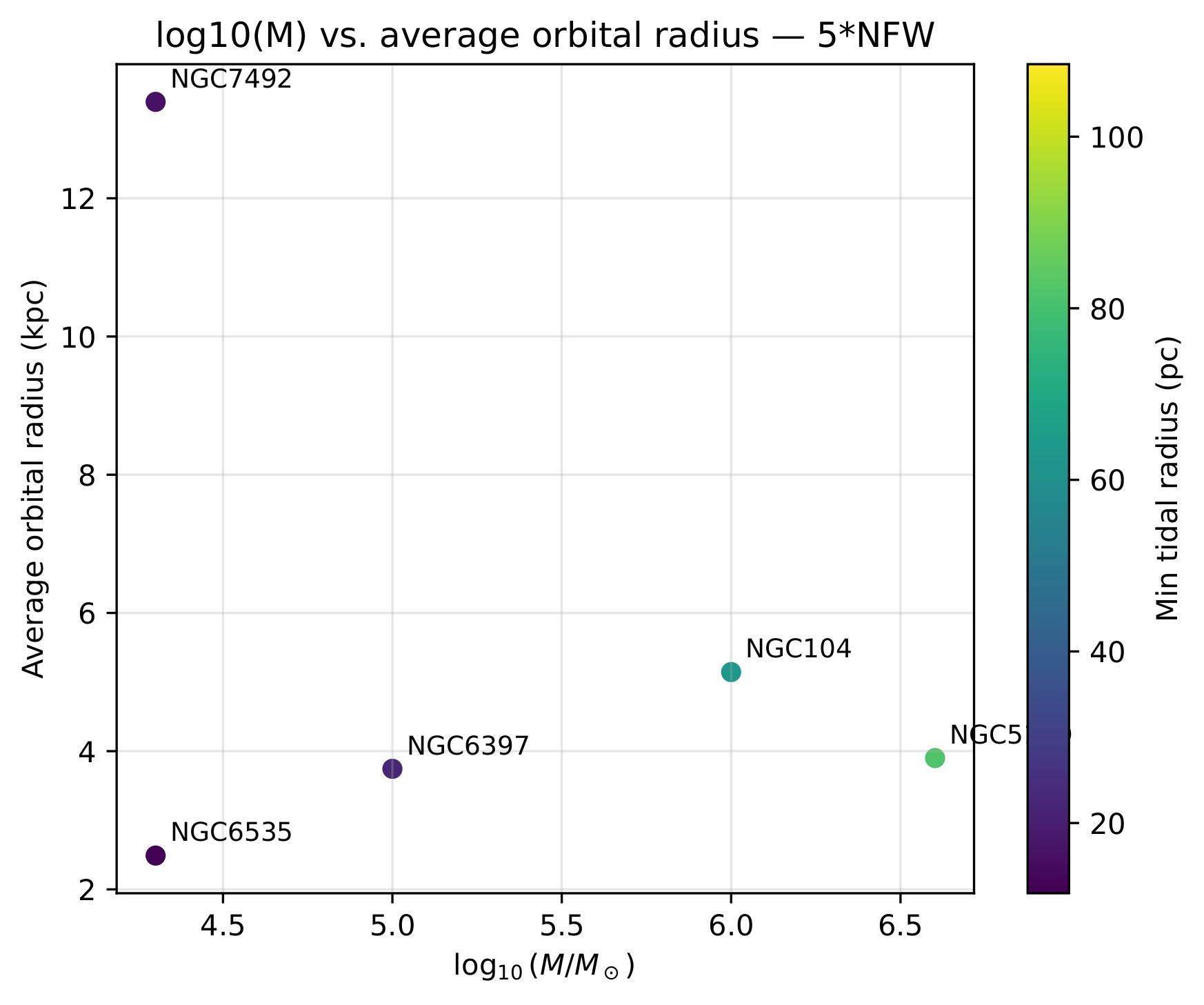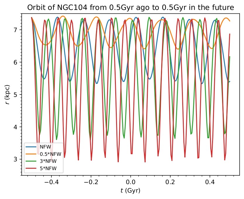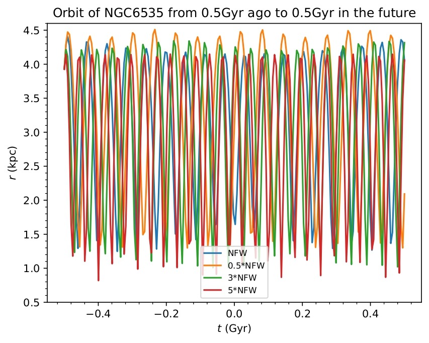 All the orbits’ plots show that as the dark matter halo gets more massive, the maximum and minimum orbital radii of the GCs decrease, and there are more revolutions over the same time interval. This implies that the orbital period is inversely proportion to the mass of the halo.