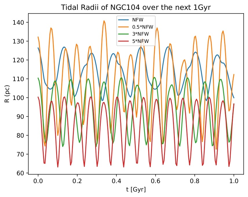 Figure 4B displays NGC104’s tidal radius against time graph under four different NFW potentials. Under the normal potential indicated in blue, the maximum tidal radius is 127.003 pc while the minimum is 98.374 pc. Under the halved NFW potential indicated in orange, the maximum tidal radius is 140.794 pc while the minimum is 72.628 pc. Under the tripled NFW potential indicated in green, the maximum tidal radius is 110.788 pc while the minimum is 74.028 pc. Under the quintupled NFW potential indicated in red, the maximum tidal radius is 100.405 pc while the minimum is 63.189 pc.
