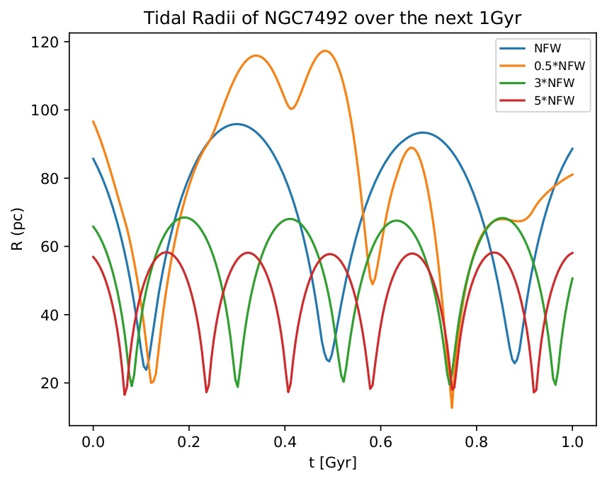 Figure 5B displays NGC7492’s tidal radius against time graph under four different NFW potentials. Under the normal potential indicated in blue, the maximum tidal radius is 95.847 pc while the minimum is 23.852 pc. Under the halved NFW potential indicated in orange, the maximum tidal radius is 117.326 pc while the minimum is 12.728 pc. Under the tripled NFW potential indicated in green, the maximum tidal radius is 68.491 pc while the minimum is 18.868 pc. Under the quintupled NFW potential indicated in red, the maximum tidal radius is 58.283 pc while the minimum is 16.529 pc.