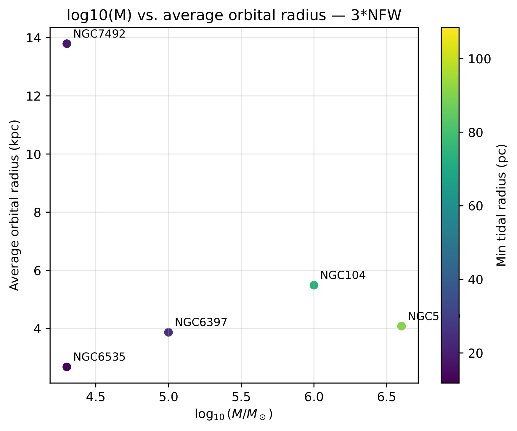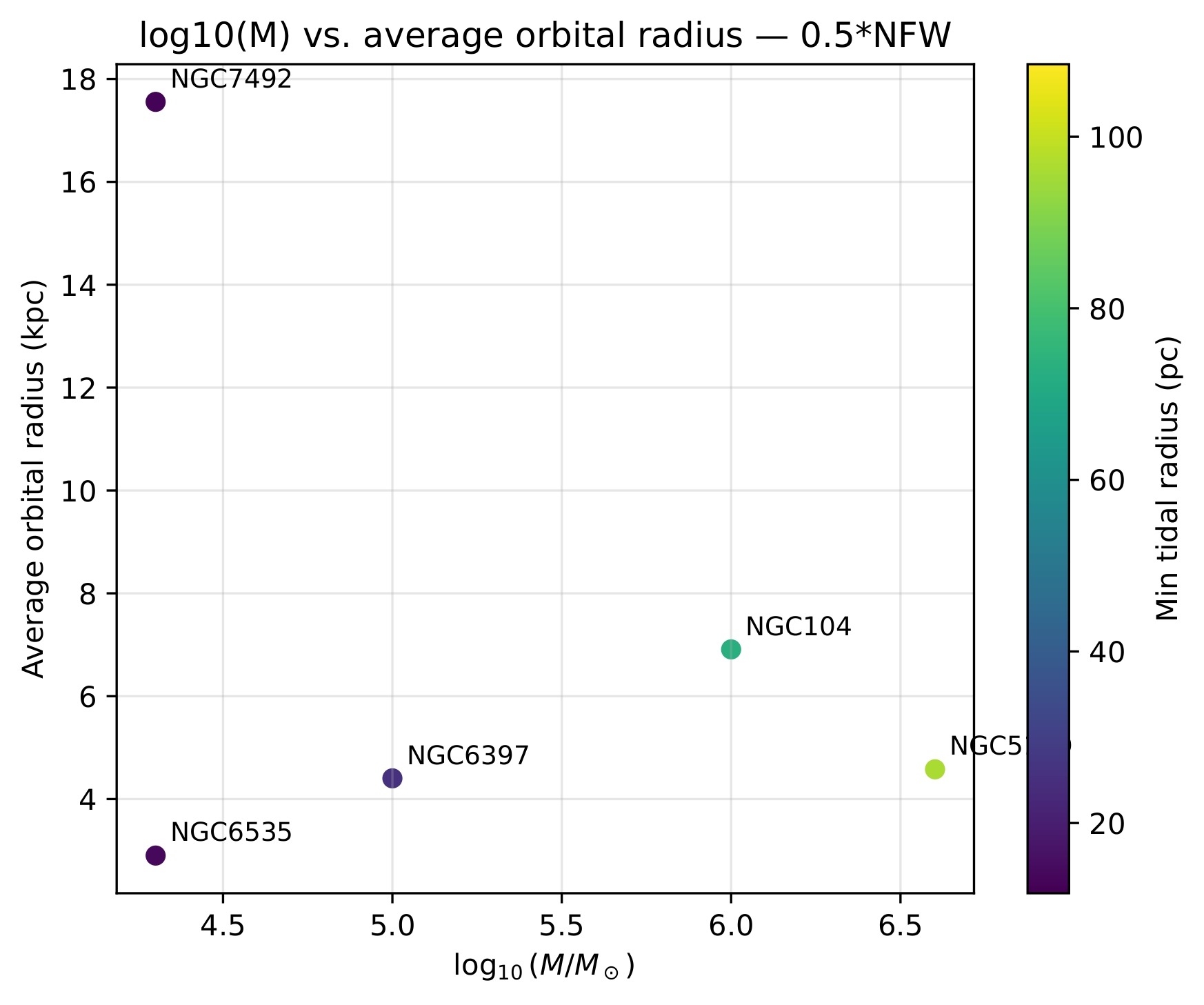 | Globular Cluster | Mass (in terms of mass of the Sun) | Half-mass Radius (pc) | Minimum Orbital Radius (kpc) | Maximum Orbital Radius (kpc) | |