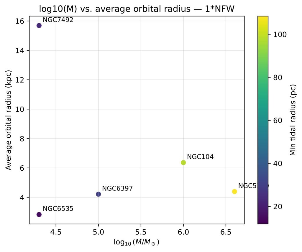 Although our Galpy-based model includes Chandrasekhar dynamical friction, it remains a simplified semi-analytic approximation compared with full N-body simulations. Future work could use N-body simulations to follow the actual stripping of stars and test why lower-mass clusters are more prone to disruption. It would also be valuable to explore how changes in the bulge or disk components affect GC lifespans. While many uncertainties remain — especially regarding the true structure of the Milky Way’s dark matter halo — studies like this help build a clearer picture of how cluster mass, orbit, and environment shape the long-term survival of globular clusters.