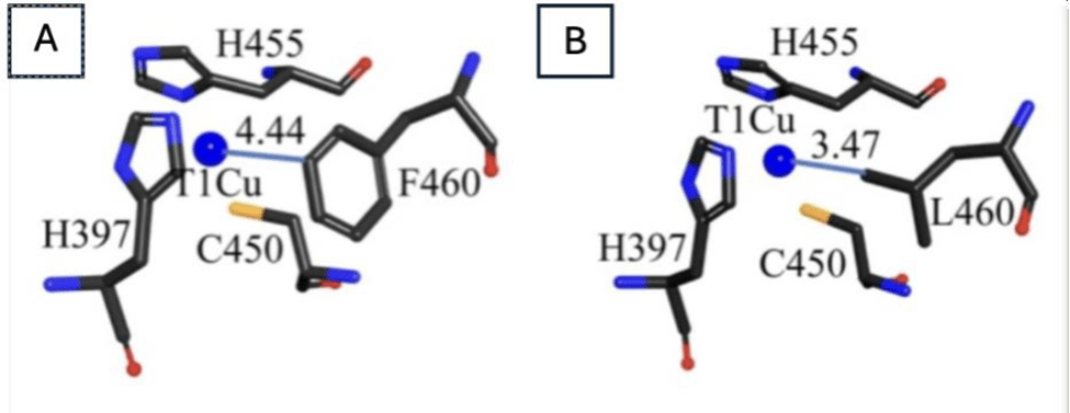 The T1 copper site is the primary electron acceptor from substrates and determines the enzyme’s redox potential. Experimental substitutions of the axial methionine ligand with hydrophobic residues such as leucine (Leu) or phenylalanine (Phe) have been shown to increase redox potentials by ~60mV, enhancing the enzyme’s oxidative capacity toward high-redox-potential substrates (Figure 2.) The results were nuanced, however, as substitutions altered coordination geometry, leading to reduced stability of the T1 copper center, showing that computational design only demonstrates laboratory scale success and that there is more research needed to be done before industrial application.