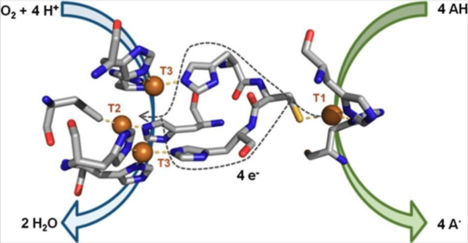 In the indirect reduction mechanism, the process also begins with the Type 1(T1) copper site. Often called the “blue copper” site due to its distinct spectroscopic properties, the T1 copper is responsible for oxidizing substrates by abstracting an electron from the organic substrate.