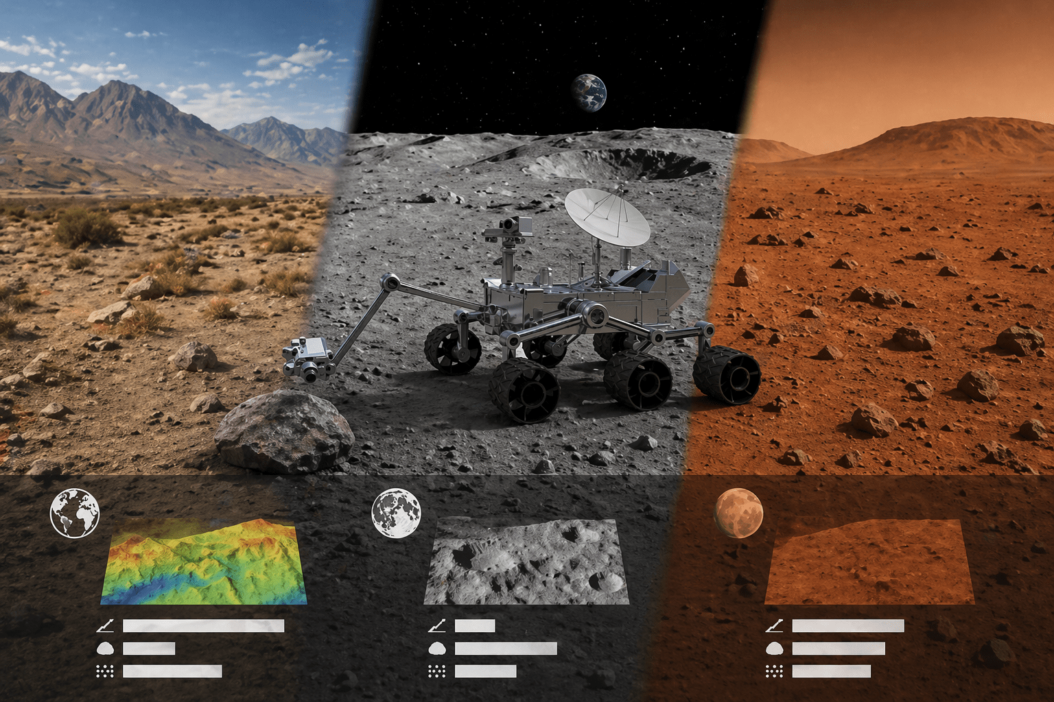 Planetary rovers are routinely tested on Earth before deployment in extraterrestrial environments, yet the selection of appropriate terrestrial test sites remains largely heuristic1,2. Sites such as Devon Island in the Canadian High Arctic, volcanic terrains in Iceland, and hyper-arid regions of the Atacama Desert are frequently chosen based on qualitative similarity, logistical accessibility, or historical precedent3,4,5,2. While these locations have proven valuable, the absence of a standardized, scalable method for comparing terrestrial terrains to planetary surfaces complicates the identification of new or complementary analog sites across large regions1,2.