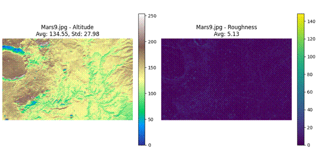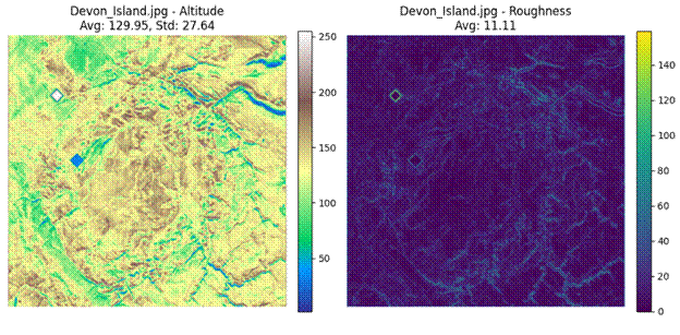 Figure 9 | Terrain analysis of Devon Island, Canada. The left panel is the altitude map (average altitude = 129.95 m, standard deviation = 27.64 m). The right panel shows the roughness index map (average roughness = 11.11).