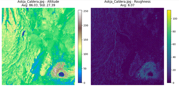 Figure 3 | Terrain analysis of Askja Caldera, Iceland. The left panel is the altitude map (average altitude = 86.03 m, standard deviation = 27.39 m). The right panel shows the roughness index map (average roughness = 6.07).
