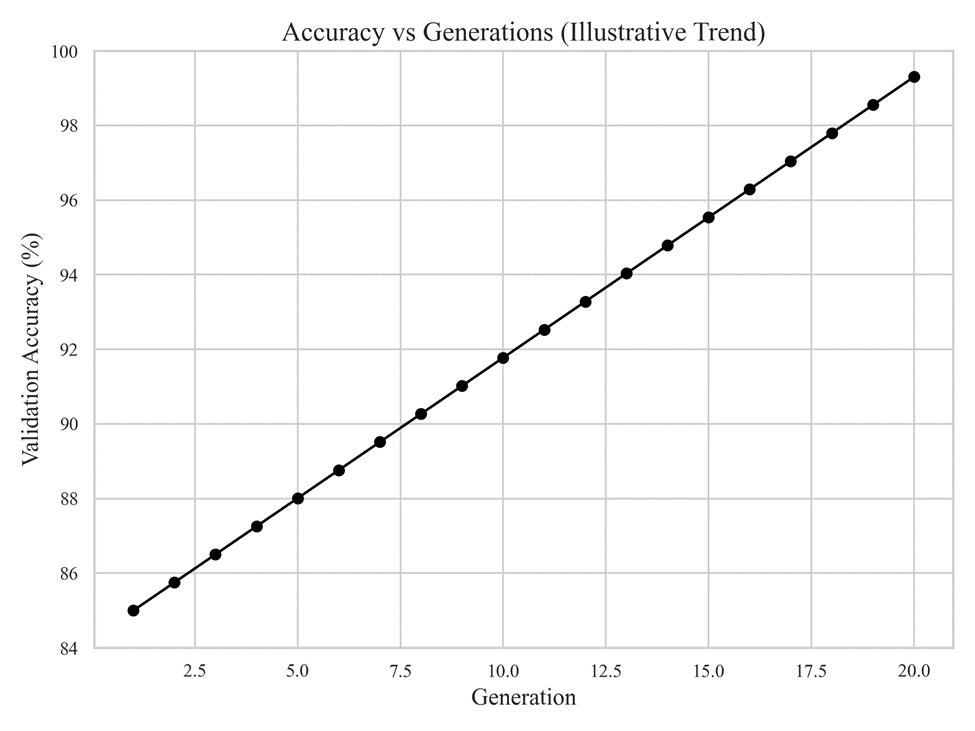 One of the primary strengths of the proposed framework is its ability to automate neural architecture discovery with minimal human intervention. Unlike manual tuning, which relies heavily on expert intuition and extensive trial-and-error, the genetic algorithm explores a diverse set of architectures in a systematic and adaptive manner. The progressive improvements observed across generations demonstrate that evolutionary pressure effectively guides the search toward higher-performing configurations.
