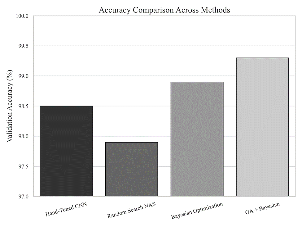Note. Validation accuracy comparison across methods. The proposed GA + Bayesian fine-tuning approach achieves higher validation accuracy compared to hand-tuned architectures, random search, and standalone Bayesian optimization, demonstrating the benefit of combining evolutionary exploration with probabilistic fine-tuning.