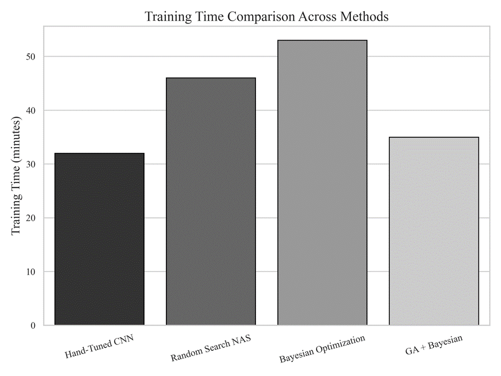 Note. Training time comparison across methods. This figure reports the training time required by each optimization strategy. While evolutionary and Bayesian methods incur additional optimization overhead, the hybrid approach remains computationally feasible and competitive relative to other automated search techniques.