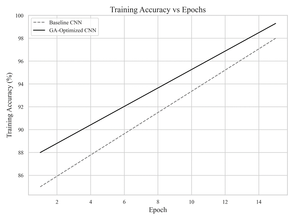 Note. Training accuracy versus epochs. The GA-optimized architecture converges more rapidly and achieves higher final training accuracy than the baseline CNN, indicating improved learning dynamics resulting from evolutionary optimization.