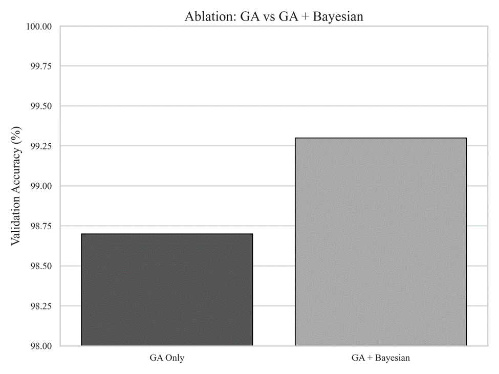 Note. Ablation study comparing GA-only and GA + Bayesian optimization. Bayesian fine-tuning consistently improves validation accuracy over GA-only architectures, highlighting the complementary role of probabilistic optimization in refining evolved models.