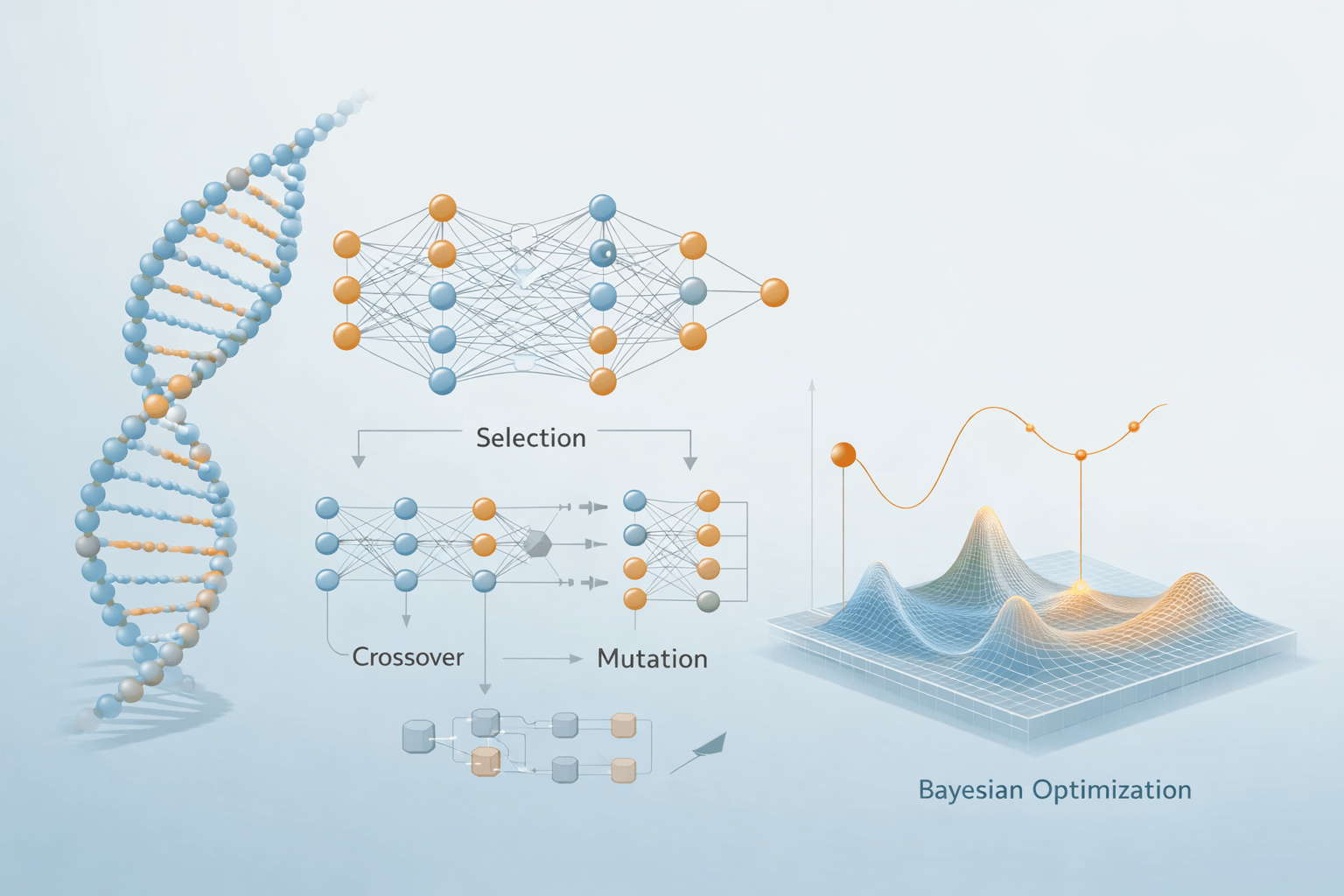 Evolutionary algorithms, and genetic algorithms (GA) in particular, provide an alternative paradigm for neural architecture optimization. Inspired by biological evolution, GA operate on populations of candidate solutions that evolve over successive generations through selection, crossover, and mutation. This population-based search enables efficient exploration of complex, discrete, and highly structured search spaces.