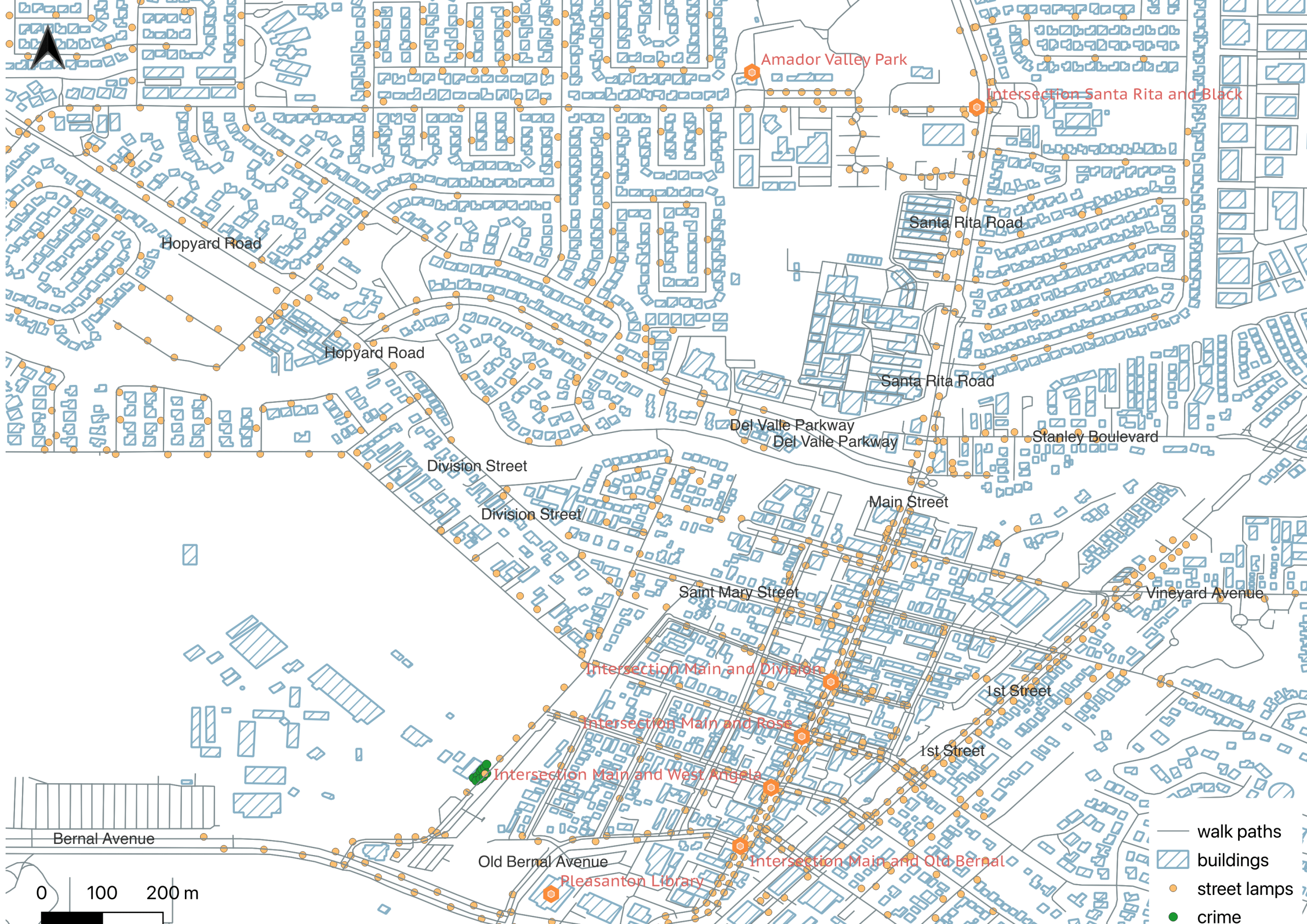 This study used open-source and municipal data about the Pleasanton downtown and adjacent areas. Data for the road network of Pleasanton downtown and pedestrian accessible walkways were collected from OpenStreetMap (OSM)9. These walkways were restricted to roads with sidewalks and were mapped using GIS to form a base network. Data about crime in the Pleasanton downtown area was collected through the Alameda County Open Data Hub10,11 and later used for calculating the amount of crime in the area. Due to the limited data available, streetlight data was manually collected or observed from satellite imagery12. In January 2026, a new version of Google Earth Professional18was released that allowed for the identification of infrastructure, including streetlights. The manually digitized data was then cross checked with this updated imagery to correct any possible errors. Additional streetlight information was added where available. Sample manual field checks were also conducted to confirm the accuracy of selected locations.