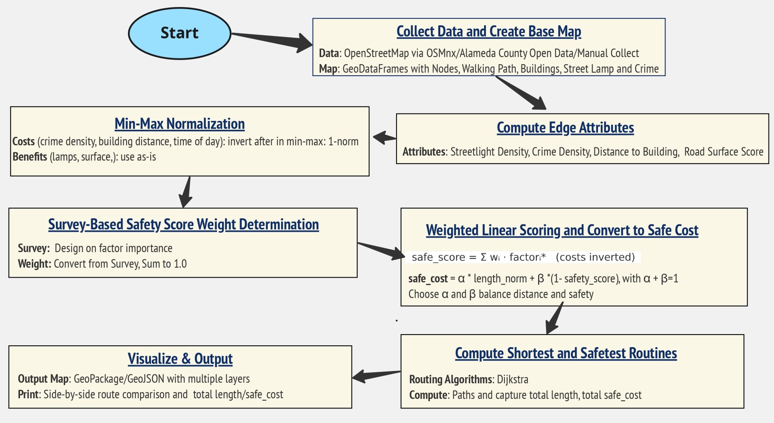 Figure 2 | Evaluation process for selecting safety-optimized walking routes in Pleasanton downtown and adjacent areas. (Rectangles = processing steps, Arrows = data flow from input datasets to the final safety score and route selection)