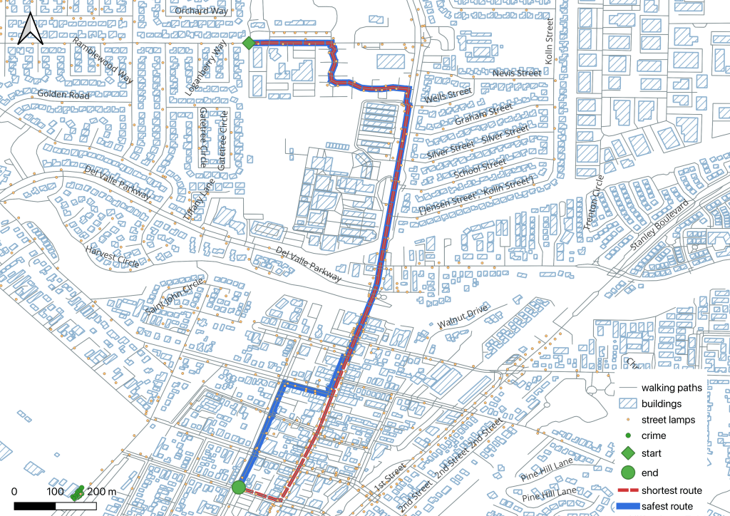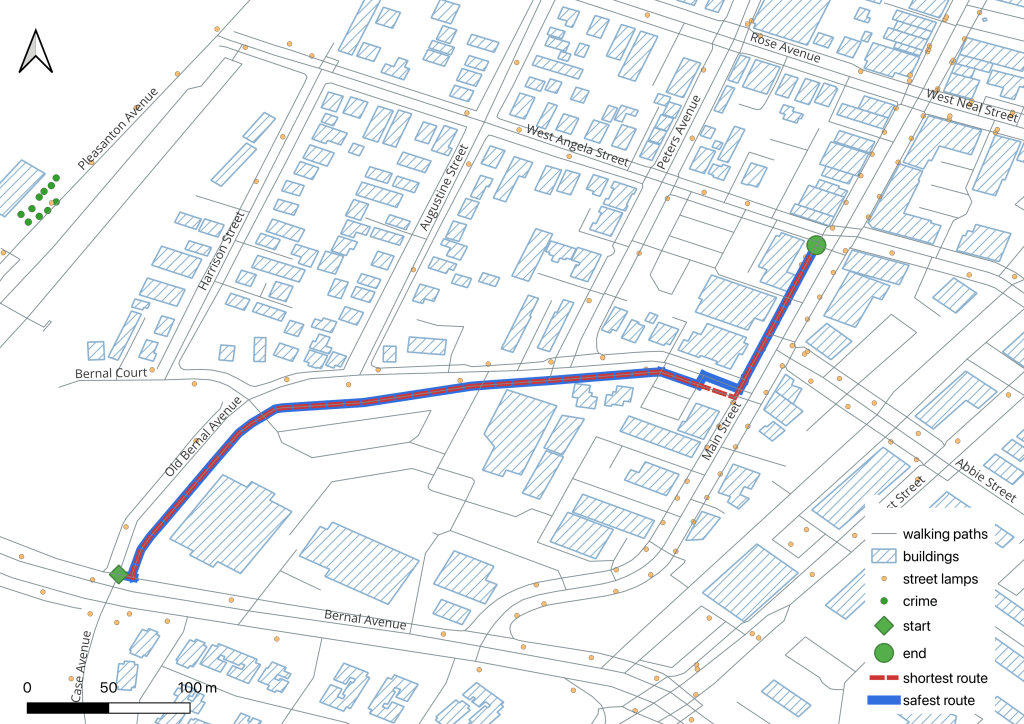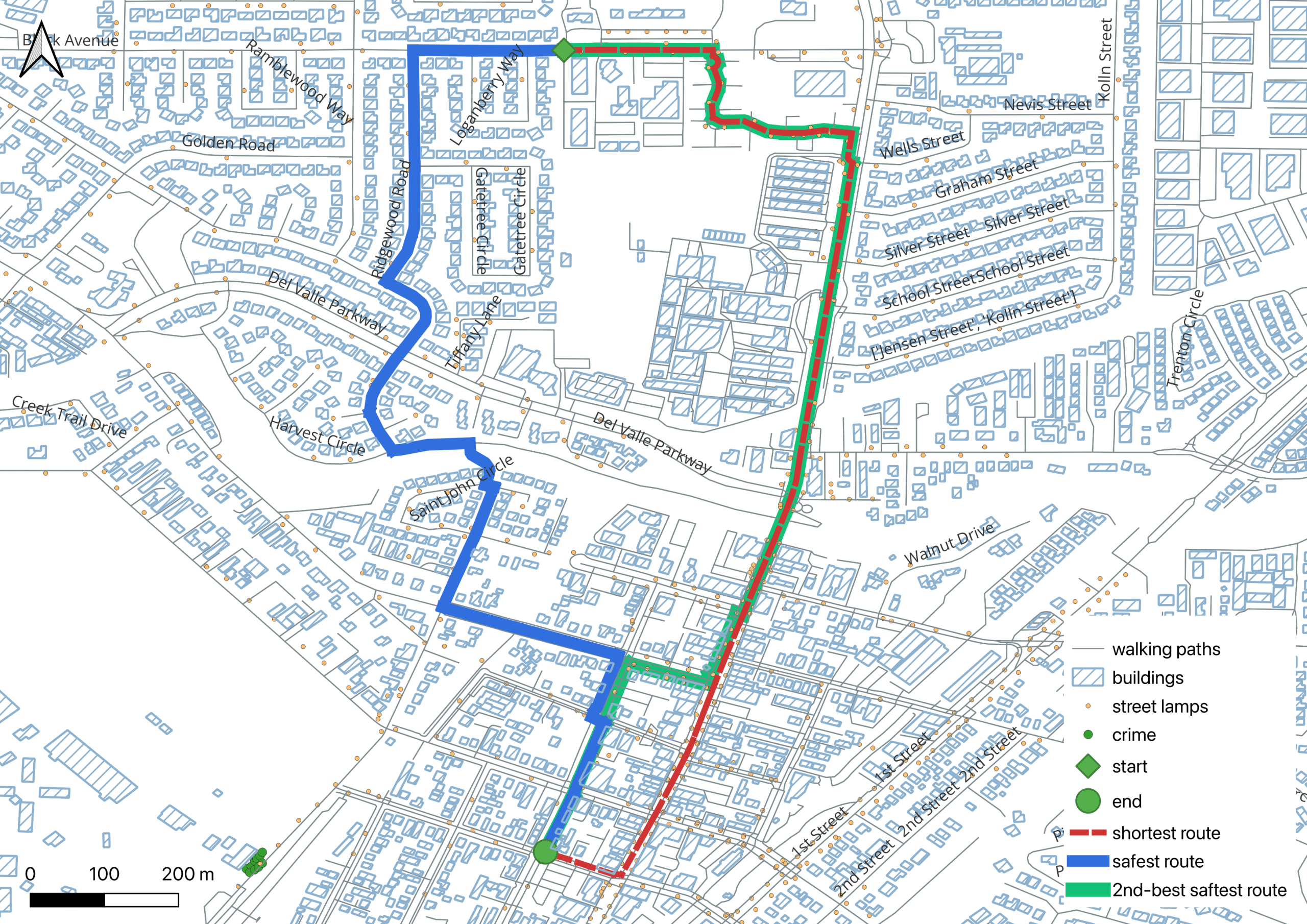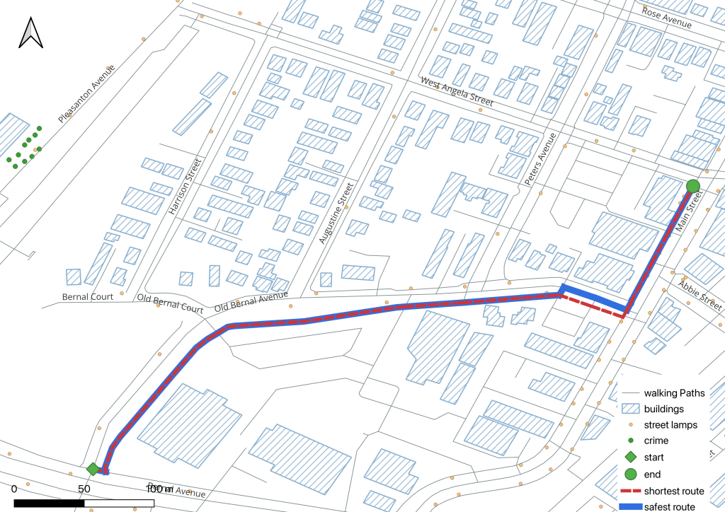 Walking is an essential form of transportation in small and medium-sized cities like Pleasanton, California. Safety is often a critical factor in determining if a pedestrian feels comfortable walking in an area1. Prior research has concluded that many factors, such as streetlight density2, crime rate3, surface quality4, proximity to buildings5, and time of day6, can strongly influence walkability and safety levels for pedestrians. However, online navigation systems typically use shortest path algorithms like Dijkstra’s algorithm7 to generate routes based on distance.