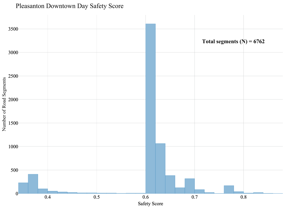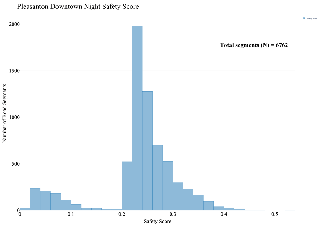 During the day, road segment safety scores were graphed on a scale of 0 to 1. The graph had two peaks: the largest peak (over 3,500segments out of total 6762 segments) appeared at approximately 0.60, and the smaller peak (about 1,100 segments) appeared at approximately 0.62. This distribution indicates that most areas in Pleasanton downtown are perceived as moderately safe. The segments that scored lower represent locations that most respondents perceived as unsafe.