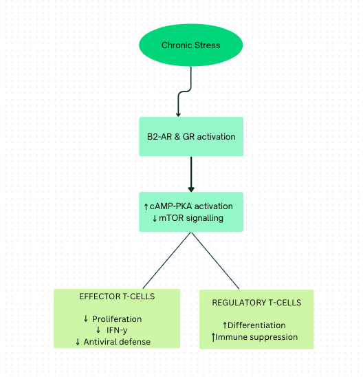 Human observational studies show reduced effector T-cell proliferation, increased T-reg cell proliferation, and lower antiviral cytokine output in individuals exposed to chronic stress. This supports a clinically relevant association between stress and impaired adaptive immunity. Animal models and in vitro experiments demonstrate that stress mediators signal through glucocorticoid receptors and β₂-adrenergic receptors to increase intracellular cAMP, suppress glycolysis, and alter IFN-γ production in a timing and activation-dependent manner. Notably, β₂-adrenergic receptor engagement suppresses IFN-γ when signalling occurs before T-cell activation but may enhance cytokine output after activation, highlighting the context-specific nature of stress effects on T-cell responses. The findings suggest that chronic stress reprograms T-cell metabolism and differentiation, leading to reduced effective responses while favouring regulatory phenotypes. Therefore, it weakens adaptive immune defence under prolonged stress conditions. T cells are major producers and regulators of cytokines; stress-induced alterations in T-cell function have downstream effects on cytokine signalling networks across the immune system.