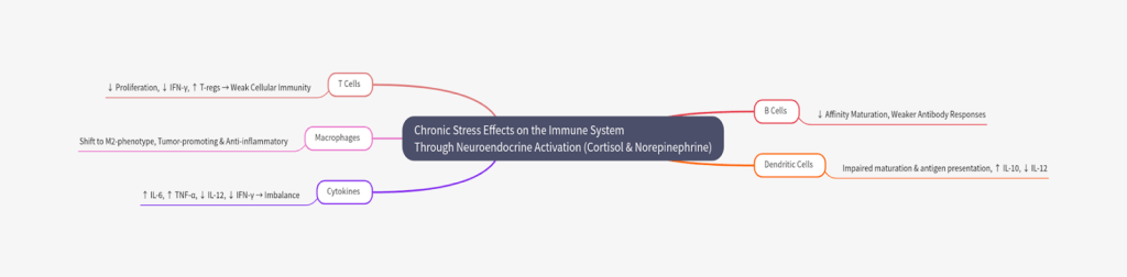 Results: Across studies, chronic stress–related β₂-adrenergic and glucocorticoid signaling in T cells is associated with reduced proliferation of effector T-cells and the expansion of T-regulatory cells. Chronic stress disrupts cytokine signalling through elevated anti-inflammatory and pro-inflammatory cytokines. B-cell studies have shown impaired germinal center reactions, resulting in reduced antibody production and diminished maturation. Findings across animal and human studies suggest that during chronic stress, macrophages polarise toward an anti-inflammatory M2 phenotype, while dendritic cells exhibit impaired maturation and antigen presentation.
