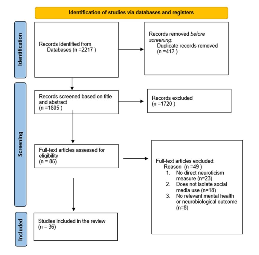 Database searches yielded 2,217 initial records. After removing 412 duplicates, 1,805 unique records underwent title and abstract screening, excluding 1,720 as irrelevant. Eighty-five full-text articles were assessed, with 49 excluded (primarily for lacking a neuroticism measure [n=23] or not isolating social media use [n=18] and no relevant mental health or neurobiological outcome [n=8]). A final set of 36 studies met all inclusion criteria (see PRISMA flow diagram, Figure 1).
