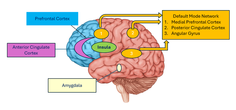 One study investigated the genetic and environmental relationships between neuroticism and rumination. A total of 877 participants were recruited from 439 same-sex twins. They were assessed with rumination, psychopathology, and neuroticism at different time points. Results indicate that neuroticism and rumination are highly genetically correlated, which means that they are different manifestations of a shared underlying genetic predisposition41. Other studies investigated the brain region involved in the rumination process. Much of this perseverative thinking likely involves the Default Mode Network, a set of brain regions (including medial prefrontal cortex, posterior cingulate, and angular gyrus) that become active during self-referential thought and mind-wandering42. For most people, the DMN activates during downtime and quiets when attention shifts outward. However, in individuals high in neuroticism, this network appears dysregulated—remaining hyperactive and difficult to disengage even when such self-focus proves unhelpful.